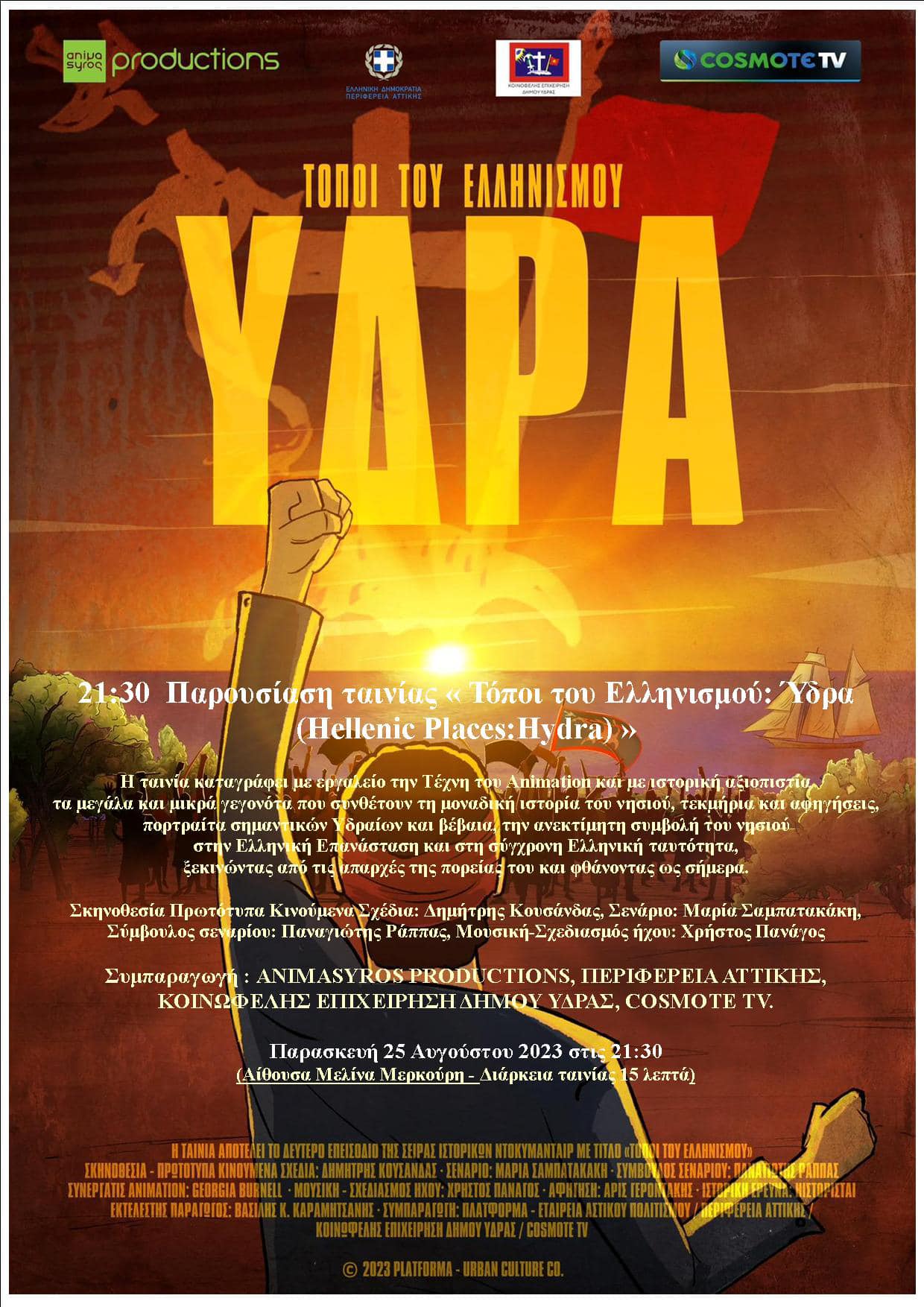 Συμπαραγωγή: Animasyros Productions, Περιφέρεια Αττικής, Κοινωφελής Επιχείρηση Δήμου Ύδρας, Cosmote TV