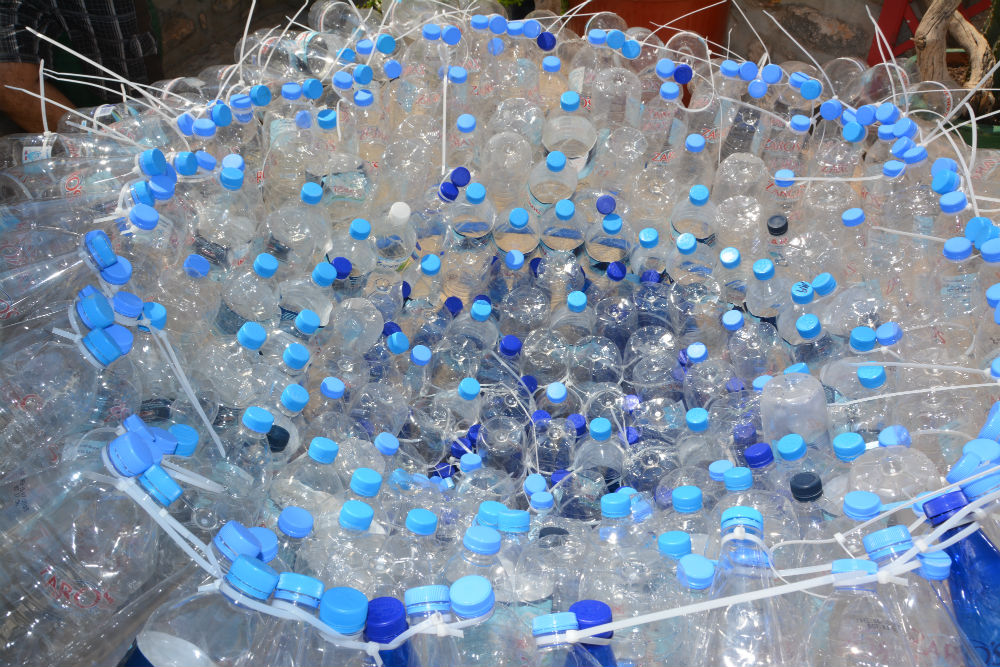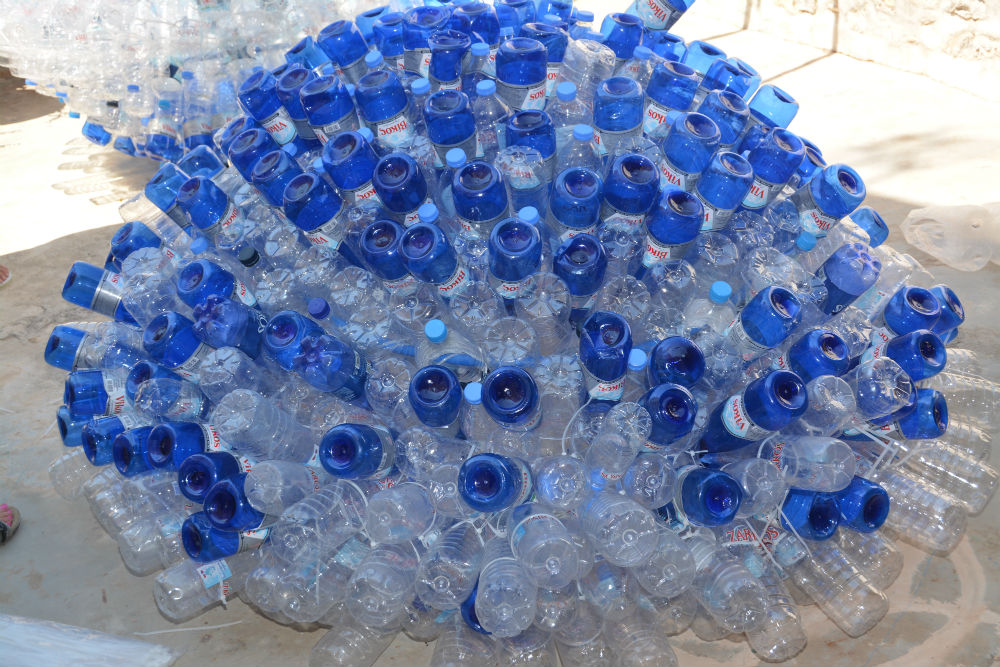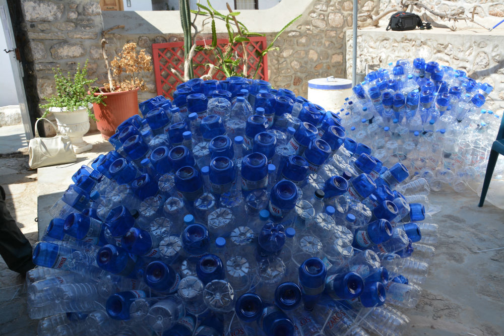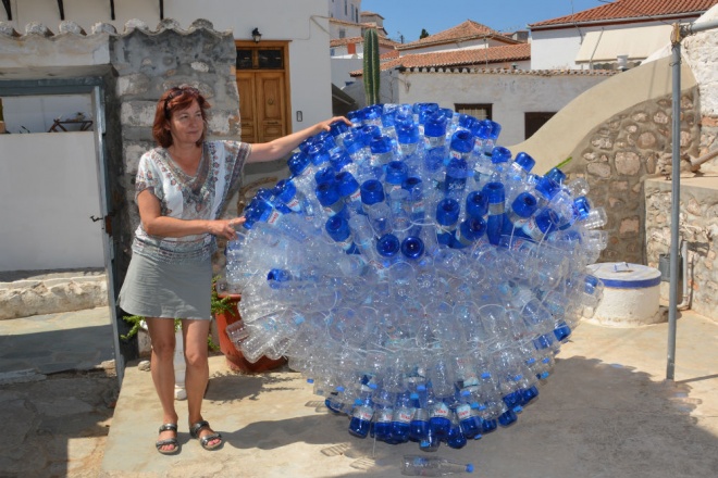 Η σφαίρα που φτάνει ήδη στη διάμετρο του 1,80μ. αποτελείται από 1500 πλαστικά μπουκάλια και χρειάστηκε πολύωρη καθημερινή δουλειά, κόπο αλλά και πολύ μεράκι για να δημιουργηθεί.