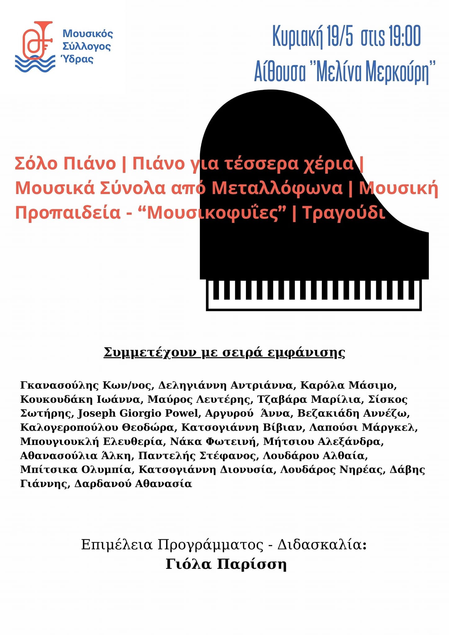 Η δεύτερη εκδήλωση θα γίνει την Κυριακή 19 Μαΐου και ώρα 19:00 με τους μαθητές/τριες πιάνου της Γιόλας Παρίσση στην αίθουσα Μελίνα Μερκούρη.