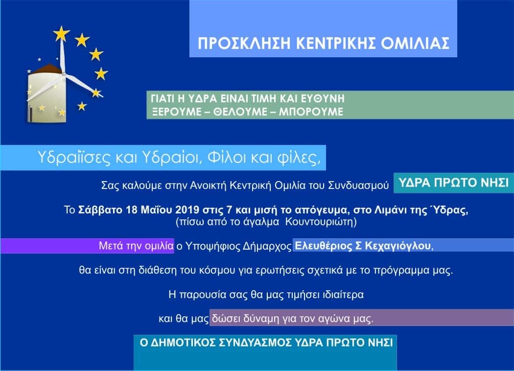 Το Σάββατο 18 Μαΐου 2019 στις 19:30 στο λιμάνι της Ύδρας (πίσω από το άγαλμα Κουντουριώτη) θα πραγματοποιηθεί η ανοικτή κεντρική ομιλία του Συνδυασμού ΥΔΡΑ ΠΡΩΤΟ ΝΗΣΙ.