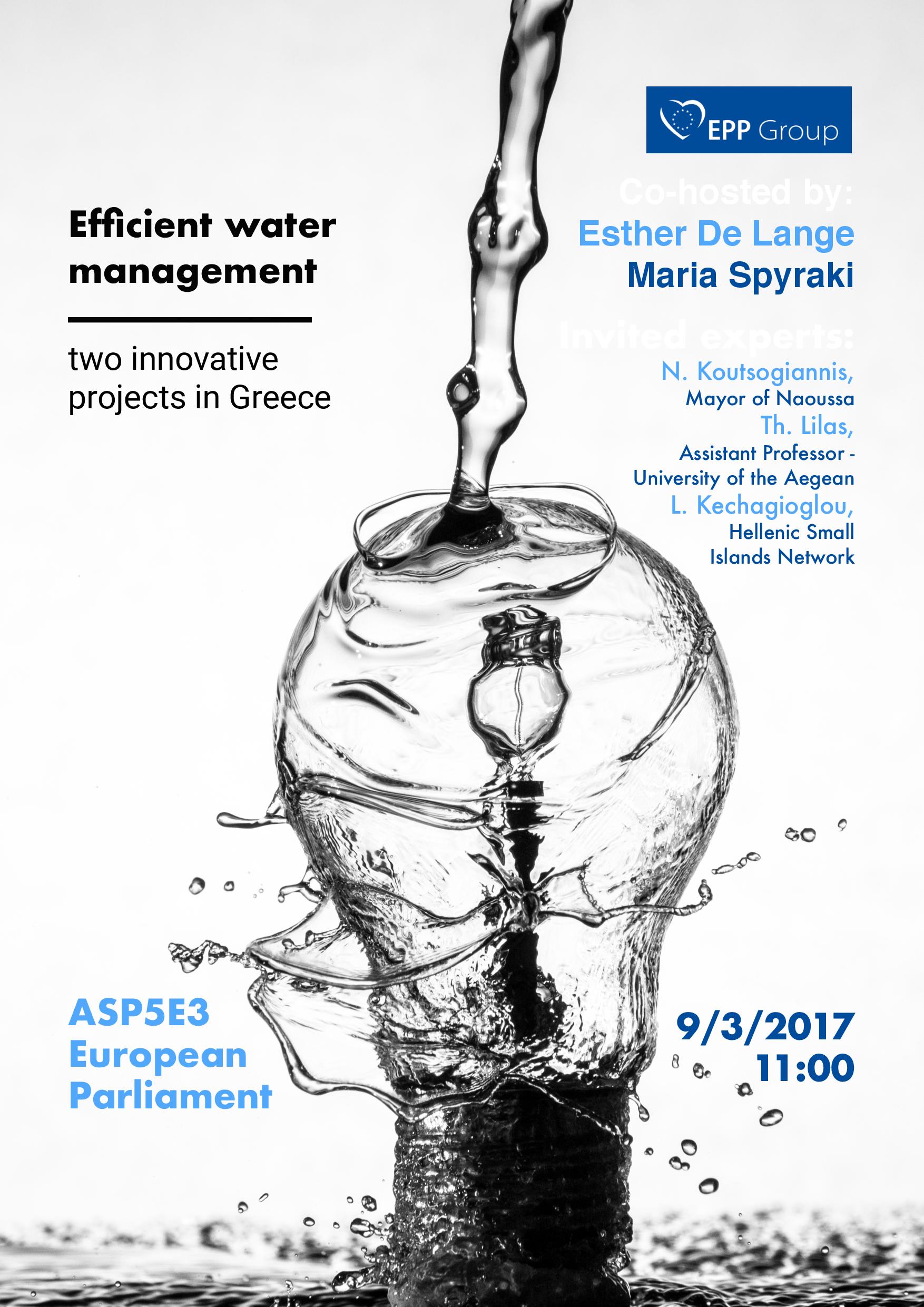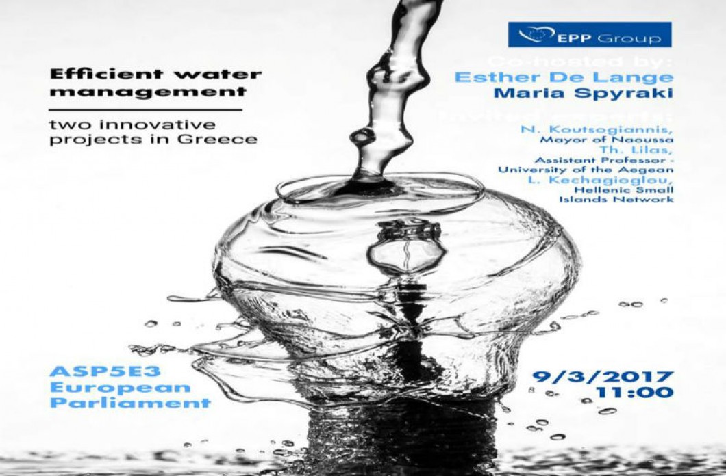 Eκδήλωση διοργανώνεται στις Βρυξέλλες στο Ευρωπαϊκό Κοινοβούλιο στις 9 Μαρτίου 2017 από τους Ευρωβουλευτές: Μαρία Σπυράκη και Esther De Lange (Ολλανδία) με θέμα: Αποδοτικότητα διαχείρισης Υδάτων και παρουσίαση ελληνικών Καινοτόμων Προγραμμάτων.