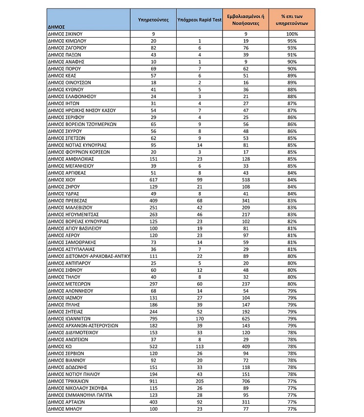 Συγκεκριμένα, με βάση τα στοιχεία που έχει συλλέξει η Κεντρική Ένωση Δήμων Ελλάδος και επεξεργάστηκε σε συνεργασία με το Υπουργείο Εσωτερικών, από τους 108.913 εργαζόμενους που υπηρετούν στους 332 Δήμους, έχουν εμβολιασθεί ή νοσήσει οι 74.884 (ποσοστό 70%), ενώ 34.029 είναι υπόχρεοι στο να υποβάλλονται σε rapid test.