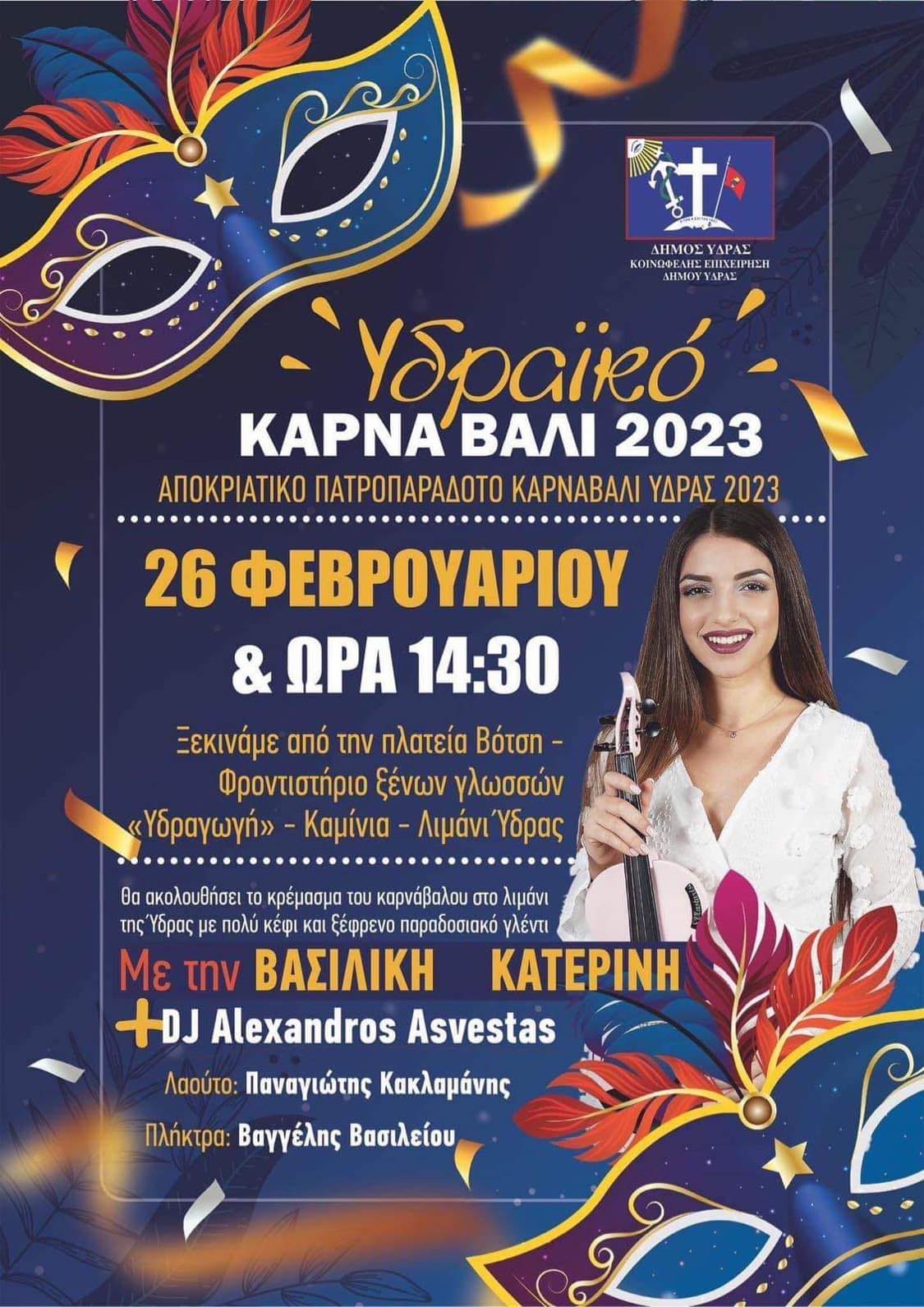 Ο Δήμος Ύδρας και η ΚΕΔΥ προσκαλεί όλες και όλους, την Κυριακή 26 Φεβρουαρίου στο Υδραϊκό Καρναβάλι 2023, και ώρα 14:30 στην πλατεία Βότση.