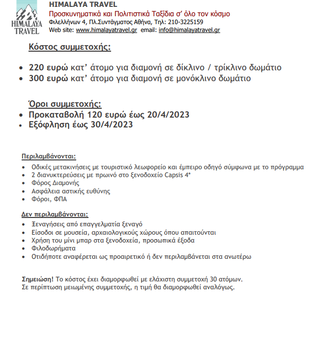 Τιμή ανά άτομο: 220€ σε δίκλινα/τρίκλινα δωμάτια με πρωινό