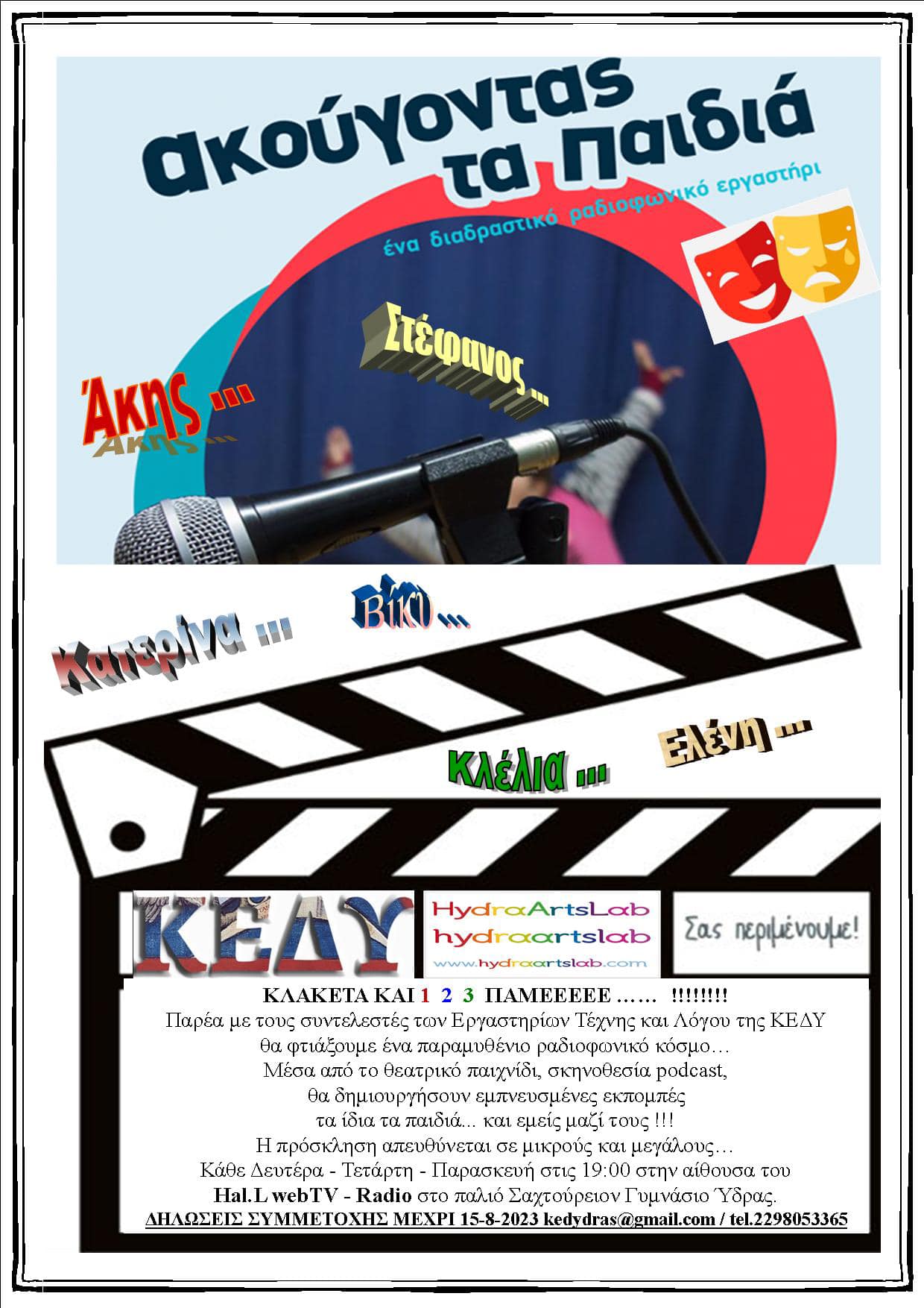 Μικροί και μεγάλοι μπορούν να δηλώσουν συμμετοχή μέχρι τις 15/8/23 στο kedydras@gmail.com και 2298053365