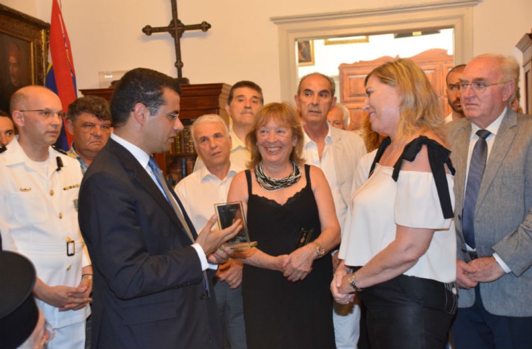 Φωτογραφία κατά την υποδοχή των επισήμων στο Δημαρχείο όπου η Βουλευτής Εύη Καρακώστα παραλαμβάνει αναμνηστικό. Εικονίζεται μεταξύ άλλων και η Βουλευτής Α' Πειραιά, Ελένη Σταματάκη.