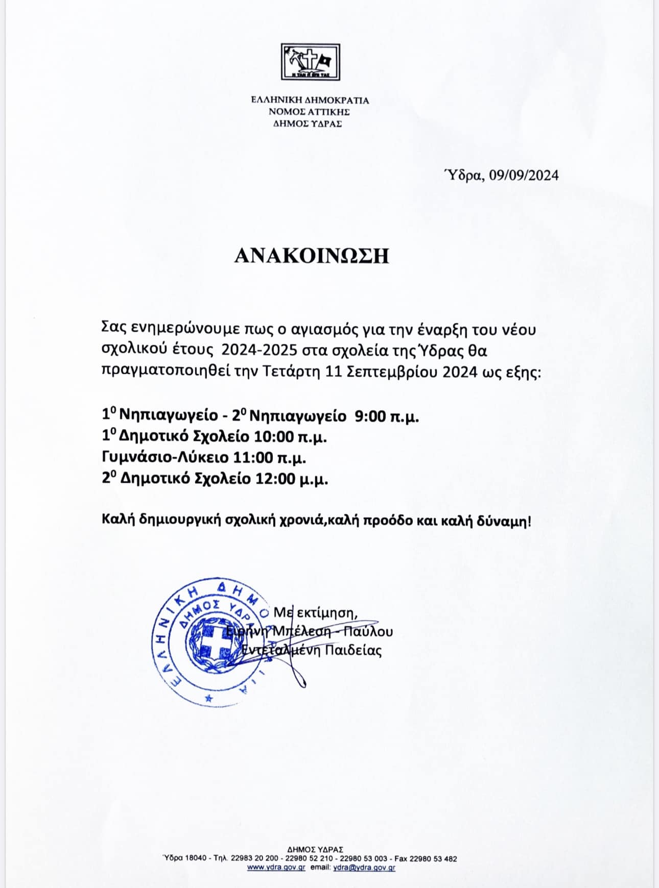 Από τον Δήμο Ύδρας και την Εντεταλμένη Δημοτική Σύμβουλο Παιδείας Ειρήνη Μπέλεση Παύλου ανακοινώθηκε το ωράριο του αγιασμού των σχολείων της Ύδρας που θα πραγματοποιηθεί την Τετάρτη 11 Σεπτεμβρίου 2024:
