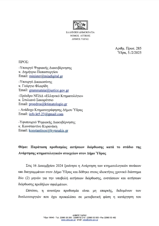 Με επιστολή του στις 5/2/25 στον Υπουργό Ψηφιακής Διακυβέρνησης Δημήτρη Παπαστεργίου, στον Υπουργό Δικαιοσύνης Γεώργιο Φλωρίδη, στον Πρόεδρο ΝΠΔΔ "Ελληνικό Κτηματολόγιο" Στυλιανό Σακαρέτσιο, στον Υφυπουργό Ψηφιακής Διακυβέρνησης Κωνσταντίνο Κυρανάκη και αρμόδιους φορείς, ο Δήμαρχος Ύδρας Γιώργος Κουκουδάκης ζητά την παράταση της ανάρτησης των κτηματολογικών πινάκων και διαγραμμάτων και τη μετάθεση της προθεσμίας υποβολής αιτήσεων διόρθωσης κατά δύο τουλάχιστον μήνες.