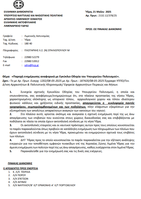 Στο πλαίσιο αυτό, κρίνεται σκόπιμη και αναγκαία η σχετική ενημέρωση περί της ως άνω απαγόρευσης των επιβατών που κινούνται στους χώρους δικαιοδοσίας και επιβιβάζονται με ποδήλατα σε πλοία τα οποία έχουν ακτοπλοϊκή σύνδεση με τη νήσο Ύδρα.