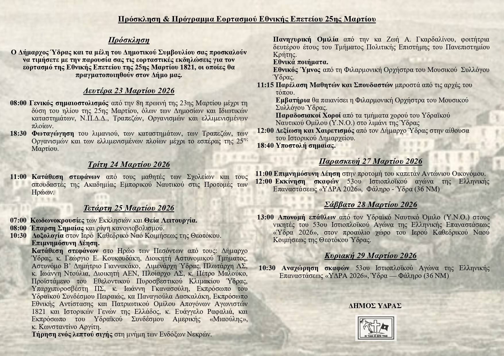 Στο πλαίσιο του εορτασμού της Εθνικής Επετείου της 25ης Μαρτίου θα πραγματοποιηθούν από τον Δήμο Ύδρας οι ακόλουθες εκδηλώσεις:
