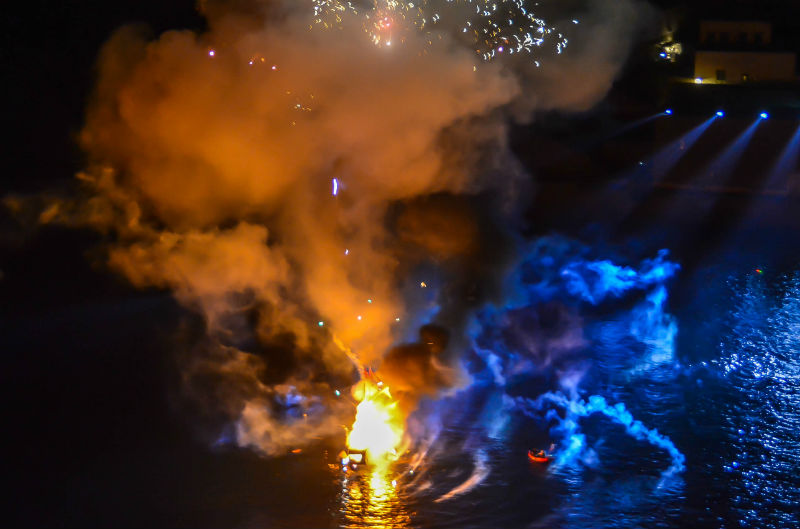 Πλήθος ανθρώπων έζησε από κοντά και φέτος την αναπαράσταση της ναυμαχίας του Γέροντα και την πυρπόληση της οθωμανικής φρεγάτας.Από νωρίς το απόγευμα έγινε η μεταφορά της ληκύθου με την καρδιά του Ναυάρχου Μιαούλη από το Ιστορικό Αρχείο-Μουσείο Ύδρας στον Ιερό Καθεδρικό Ναό Κοιμήσεως Θεοτόκου. Και στη συνέχεια πραγματοποιήθηκε η υποδοχή των επισήμων στο Δημαρχείο από τον Δήμαρχο Γιώργο Κουκουδάκη και το Δημοτικό Συμβούλιο και η καθιερωμένη απόδοση των αναμνηστικών των Μιαουλείων. Μεταξύ των επισήμων ήταν ως εκπρόσωπος της Κυβέρνησης ήταν ο Υπουργός Ναυτιλίας Θοδωρής Δρίτσας, καθώς βουλευτές, δήμαρχοι και η στρατιωτική ηγεσία της χώρας. Ακολούθησε στο λιμάνι η παρουσίαση της αναπαράστασης μετά την ομιλία και τον χαιρετισμό του Δημάρχου. Η αναπαράσταση είχε θεατρικότητα, πλούσιο φως και έγινε κάτω από τη σκηνοθετική επιμέλεια του Τάκη Τζαμαργιά. Ο καιρός ήταν σύμμαχος παρά τις δυσοίωνες προβλέψεις. Τα πυροτεχνήματα κορύφωσαν όμορφα τον εορτασμό.Στο πέταλο του νησιού ήταν διάσπαρτα χορευτικά του Υδραϊκού Ναυτικού Ομίλου που έδωσαν νησιώτικο και παραδοσιακό χρώμα στη μεγάλη αυτή γιορτή τιμής.