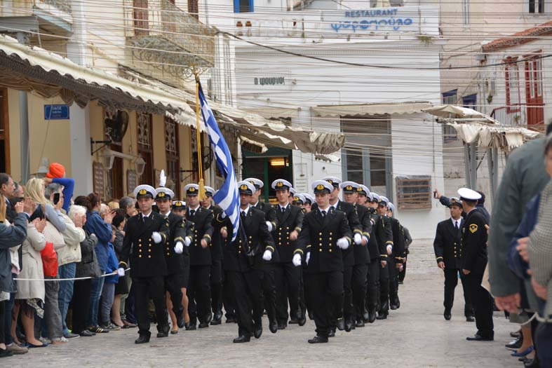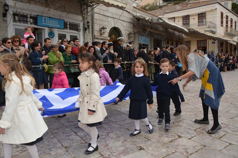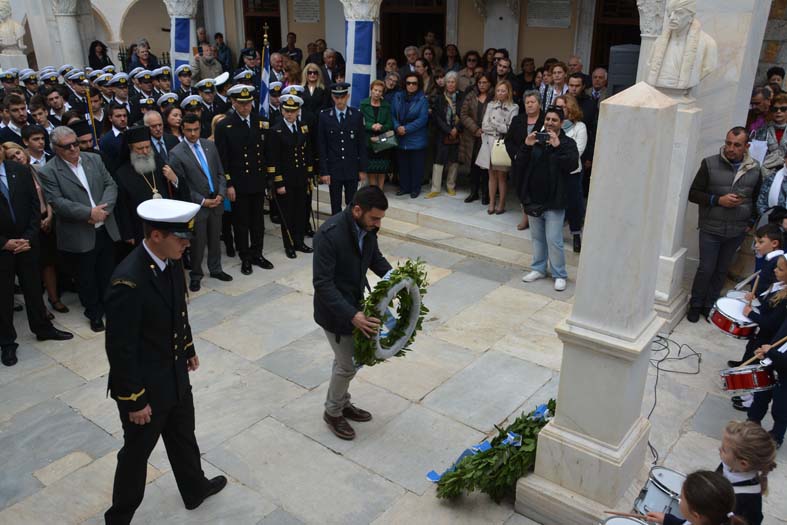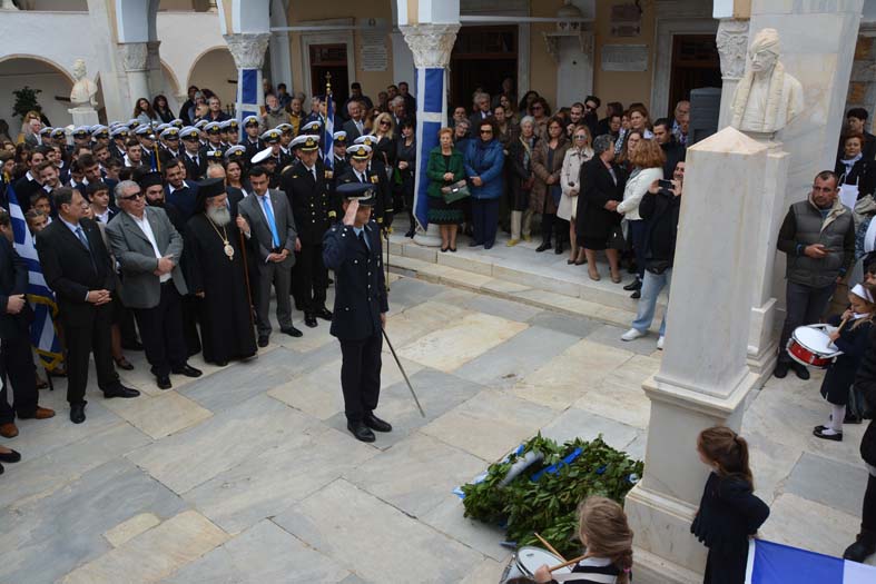 Με τη λήξη πλήθος κόσμου αποχώρησε από τον προαύλιο χώρο της Μητρόπολης και μεταφέρθηκε έξω στην παραλία όπου παρακολούθησε και χειροκρότησε με ενθουσιασμό την όμορφη παρέλαση των μαθητών των σχολείων και των σπουδαστών της ΑΕΝ. Να σημειώσουμε ότι Τελετάρχης της εκδήλωσης ήταν ο Δημήτρης Δάβης.