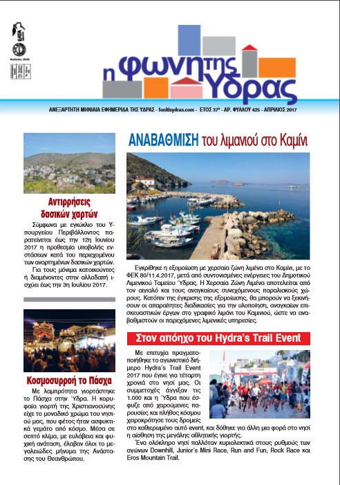 Κυκλοφόρησε το τεύχος Απριλίου της «Φωνής της Ύδρας» (Α.φ. 425), με όλη την επικαιρότητα του νησιού. Με πλούσια ενημερωτική ύλη, άρθρα, σχολιασμούς και επισημάνσεις για τα καθημερινά ζητήματα, αντικειμενικά και εμπεριστατωμένα. Διαβάστε μεταξύ άλλων: Αναβάθμιση του λιμανιού στο Καμίνι, Στον απόηχο του Hydra’s Trail Event και... παραλειπόμενα, Αντιρρήσεις δασικών χαρτών, Κοσμοσυρροή το Πάσχα στην Ύδρα, Η ΦτΥ μαζί με το ΕΔΜΝ στις Βρυξέλλες, Η επετειακή παράσταση της θεατρικής ομάδας «ΟΡΑΜΑ, Εκδηλώσεις συλλόγων, Ανδρέας Μιαούλης ο Ναύαρχος ηγέτης, το περισκόπιο του μήνα, πολιτιστικά, κοινωνικά και πολλά άλλα.