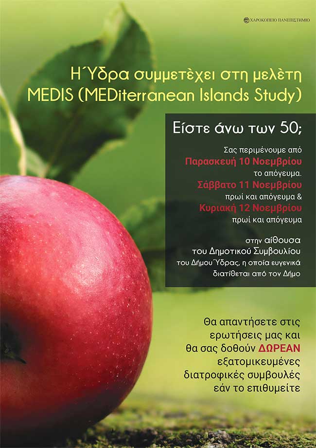 Στην επιδημιολογική μελέτη MEDIS (MEDiterranean Islands Study) του Χαροκόπειου Πανεπιστημίου συμμετέχει η Ύδρα στις 10-11-12 Νοεμβρίου 2017.