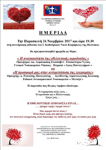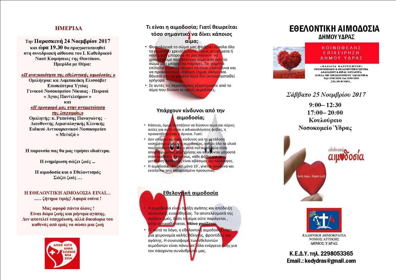 Hμερίδα με Θέμα «Η προσφορά μας στην αντιμετώπιση της λευχαιμίας και η αναγκαιότητα της Εθελοντικής Αιμοδοσίας», διοργανώνει ο Δήμος Ύδρας και η Κοινωφελής Επιχείρηση Δήμου Ύδρας (ΚΕΔΥ) σε συνεργασία με το Κουλούρειο Νοσοκομείο, το Νοσοκομείο «Μεταξά» και το Γενικό Νοσοκομείο Νίκαιας- Πειραιά « Άγιος Παντελεήμων», την Παρασκευή 24 Νοεμβρίου 2017 και ώρα 19.30 στη συνεδριακή αίθουσα του Ι. Καθεδρικού Ναού Κοιμήσεως Θεοτόκου Ύδρας.