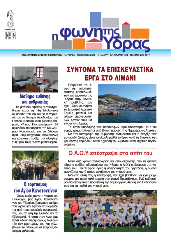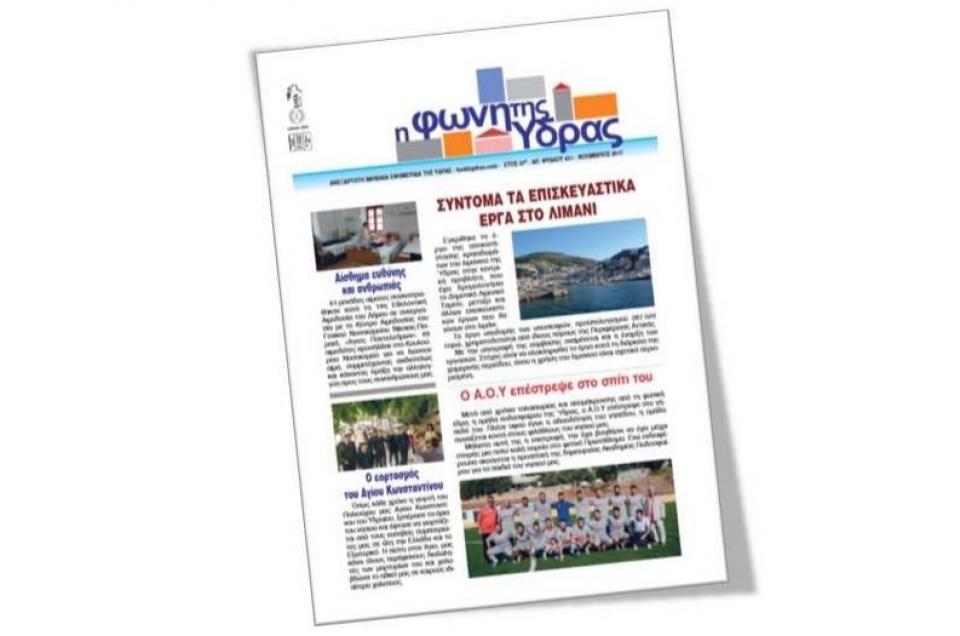 Κυκλοφόρησε το τεύχος Νοεμβρίου της «Φωνής της Ύδρας» (Α.φ. 431), με όλη την επικαιρότητα του νησιού. Με πλούσια ενημερωτική ύλη, άρθρα, σχολιασμούς και επισημάνσεις για τα καθημερινά ζητήματα, αντικειμενικά και εμπεριστατωμένα. Διαβάστε μεταξύ άλλων: Σύντομα τα επισκευαστικά έργα στο λιμάνι, ο Α.Ο.Υ επέστρεψε στο σπίτι του, Αίσθημα ευθύνης και ανθρωπιάς στη 14η Εθελοντική Αιμοδοσία, Ο Εορτασμός του Αγίου Κωνσταντίνου του Υδραίου σε όλη την Ελλάδα, Απόγνωση για τις ελλείψεις καθηγητών, Διεκδικήσεις για το Σαν Τζόρτζι, Η Ύδρα στη Philoxenia, νέες επιχειρήσεις στο νησί, το περισκόπιο του μήνα, πολιτιστικά, κοινωνικά και πολλά άλλα.