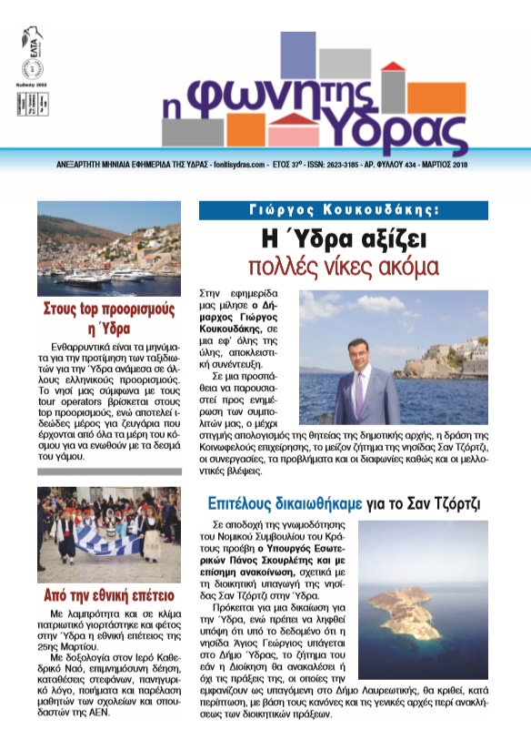 Κυκλοφόρησε το τεύχος Μαρτίου 2018 της «Φωνής της Ύδρας» (Α.φ. 434), με όλη την επικαιρότητα του νησιού.
