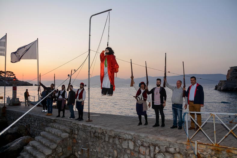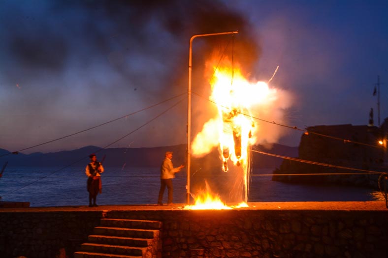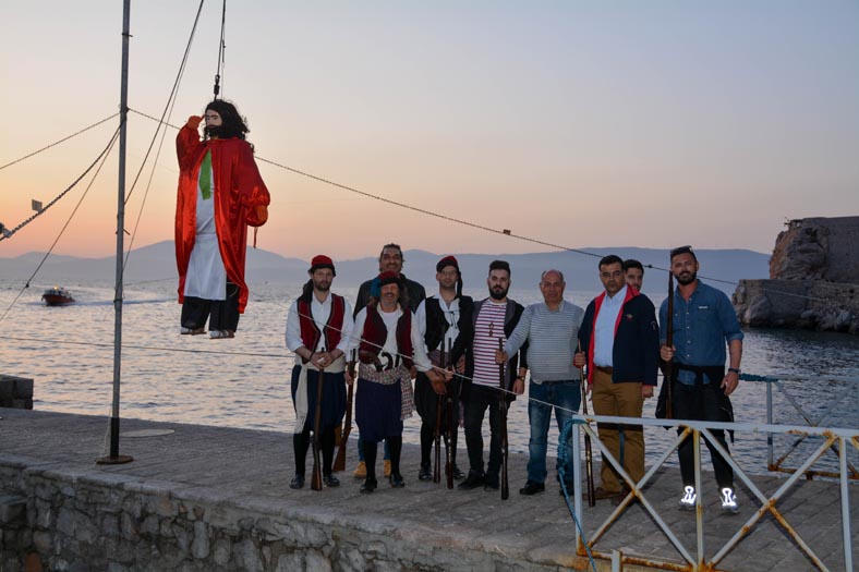 Αμέσως μετά, ο Γιούδας τυλίχθηκε στις φλόγες, και οι εύστοχες τουφεκιές με τη συμμετοχή ακόμα και του Δημάρχου Γ. Κουκουδάκη και του Αντιδημάρχου Ύδρας, Γ. Μπελεγρή και του δημοτικού συμβούλου Μ. Καραμήτσου τον μετέτρεψαν πολύ γρήγορα σε παρανάλωμα του πυρός.