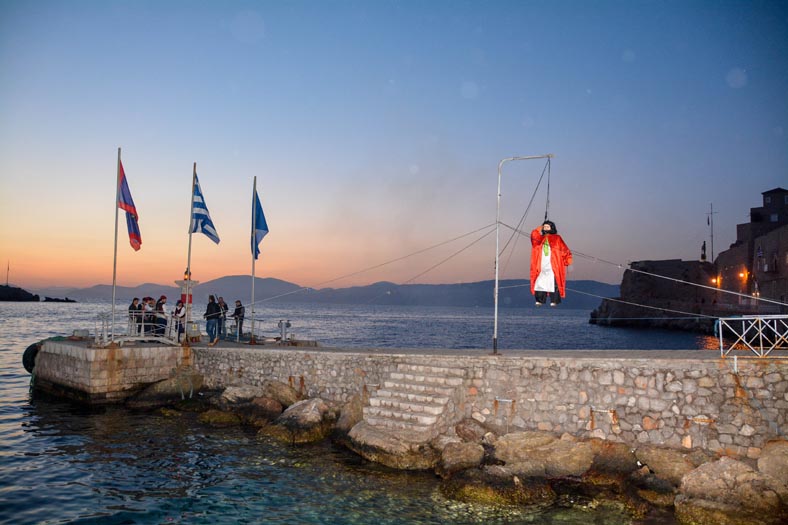 Εκεί κρεμόταν από ένα σκοινί, το ομοίωμα του Γιούδα που δημιουργείται κάθε χρόνο από τους συνεχιστές του εθίμου και που απαιτεί πολύωρη διαδικασία υλοποίησης, αλλά ταυτόχρονα και πολύ μεράκι στην τήρηση της κατασκευής όπως την έφτιαχναν οι παλαιοί Υδραίοι. Να φορά δηλαδή το ομοίωμα του Γιούδα κόκκινο χιτώνα, να κρατά στο αριστερό του χέρι συμβολικά μια σακουλίτσα με τα «Τριάντα αργύρια» της προδοσίας ενώ το δεξί του χέρι με το δάχτυλο στα μηνίγγια, να είναι σαν να νουθετεί τον ίδιο, και να του λέει, «Βάλε μυαλό»