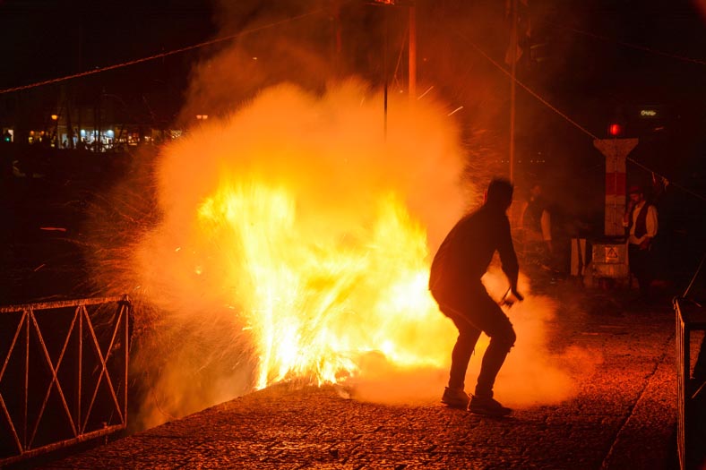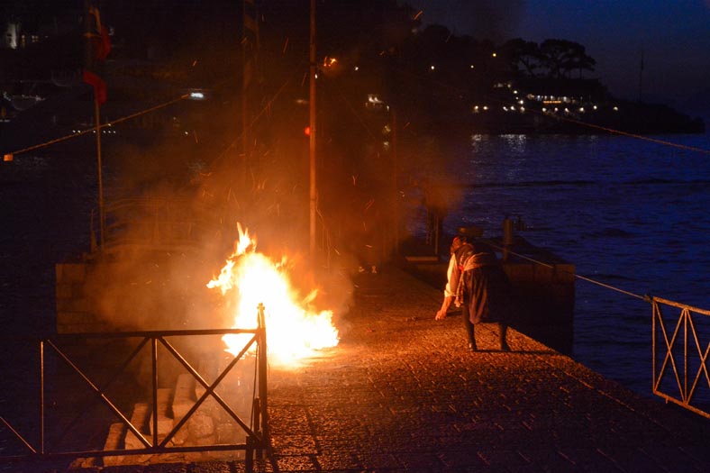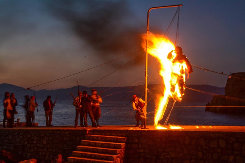 Πριν την έναρξη της διαδικασίας, όσοι Υδραίοι συμμετείχαν στο έθιμο, ξεκίνησαν σύμφωνα με την παράδοση τις τουφεκιές, για να προετοιμαστεί το έδαφος μέχρι την ολοκληρωτική καύση.