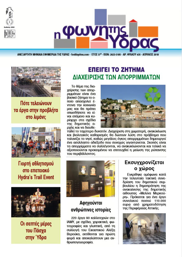 Κυκλοφόρησε το τεύχος Aπριλίου 2018 της «Φωνής της Ύδρας» (Α.φ. 435), με όλη την επικαιρότητα του νησιού.