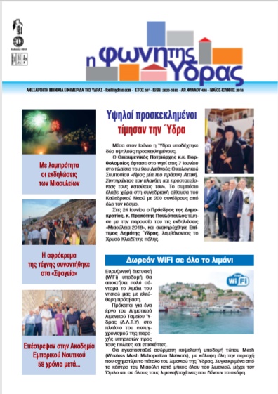 Κυκλοφόρησε το τεύχος Μαΐου-Ιουνίου 2018 της «Φωνής της Ύδρας» (Α.φ. 436), με όλη την επικαιρότητα του νησιού.