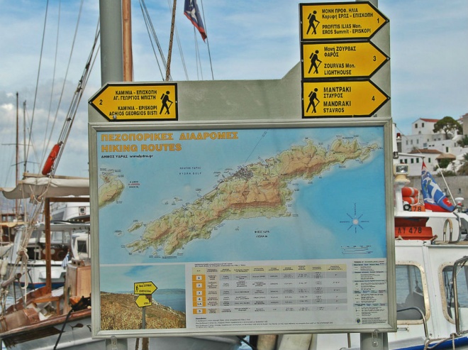 Στο κέντρο του λιμανιού έχει τοποθετηθεί ξύλινος πίνακας με χάρτη του νησιού, ο οποίος λειτουργεί ως σημείο εκκίνησης και παρέχει όλες τις απαραίτητες πληροφορίες για την κάθε διαδρομή.