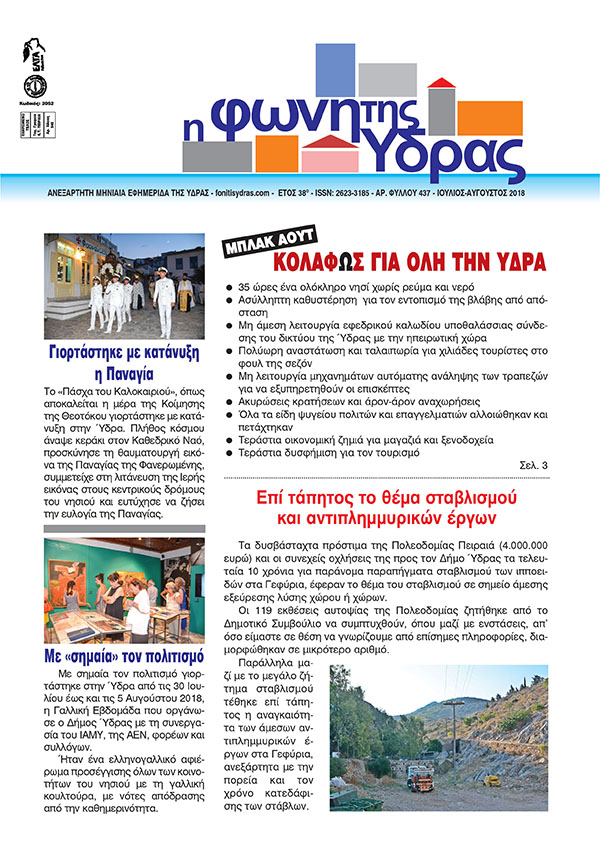 Κυκλοφόρησε το τεύχος Ιουλίου-Αυγούστου 2018 της «Φωνής της Ύδρας» (Α.φ. 437), με όλη την επικαιρότητα του νησιού.