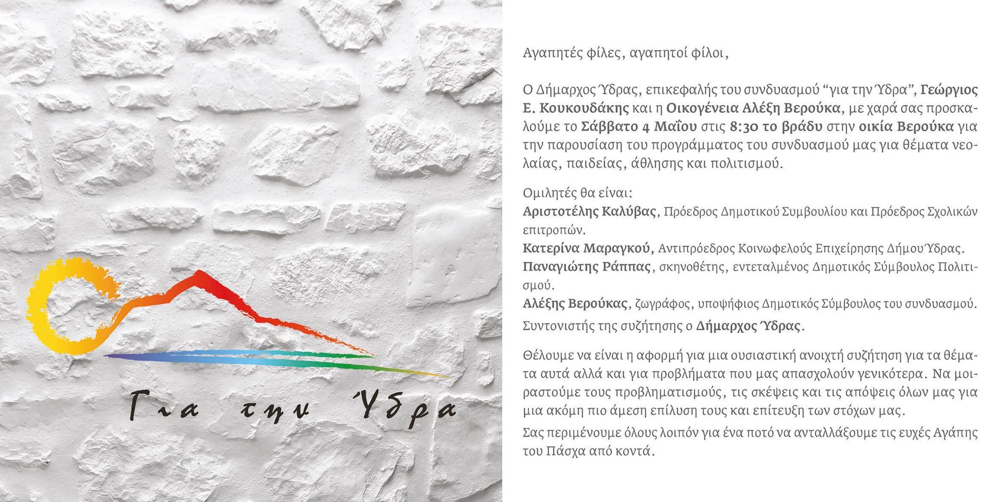 Το Σάββατο 4 Μαΐου στις 8:30 το βράδυ ο Δήμαρχος Ύδρας, επικεφαλής του Συνδυασμού "Για την Ύδρα" Γεώργιος Ε. Κουκουδάκης και η οικογένεια Αλέξη Βερούκα προσκαλούν στην οικία Βερούκα (δίπλα στο ξενοδοχείο AΓΓΕΛΙΚΑ) για την παρουσίαση του προγράμματος του συνδυασμού για θέματα νεολαίας, παιδείας, άθλησης και πολιτισμού.