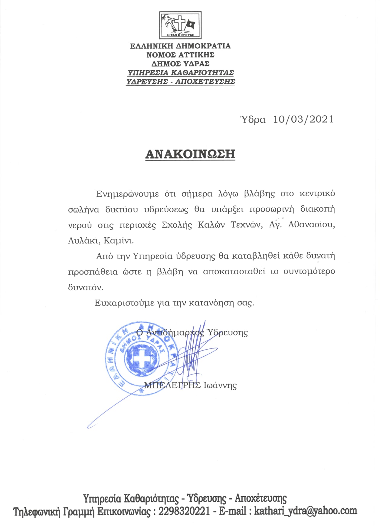 Ο Αντιδήμαρχος Καθαριότητας - Ύδρευσης - Αποχέτευσης, Γιάννη Μπελεγρής δήλωσε σχετικά με τις βλάβες: