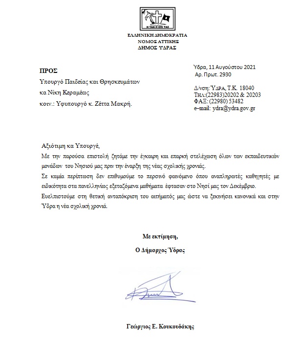Επιστολή προς την Yπουργό Παιδείας και Θρησκευμάτων Νίκη Κεραμέως απέστειλε ο Δήμαρχος Ύδρας Γιώργος Κουκουδάκης σχετικά με την έγκαιρη και επαρκή στελέχωση όλων των εκπαιδευτικών μονάδων του Νησιού μας πριν την έναρξη της νέας σχολικής χρονιάς.