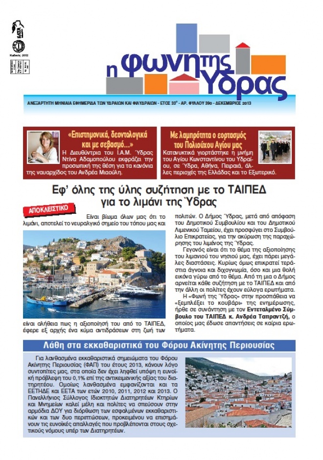 Όλη η επικαιρότητα του νησιού μας συγκεντρωμένη στην εφημερίδα μας. Με πλούσια ενημερωτική ύλη, άρθρα, σχολιασμούς, επισημάνσεις. Με μια αποκλειστική συνέντευξη για την αξιοποίηση του λιμανιού της Ύδρας από το ΤΑΙΠΕΔ που θα συζητηθεί. Διαβάστε μεταξύ άλλων: Λάθη στα εκκαθαριστικά του Φόρου Ακίνητης Περιουσίας, προεκλογικές κινήσεις, το περισκόπιο του μήνα και καίρια ζητήματα που απασχολούν το νησί μας.