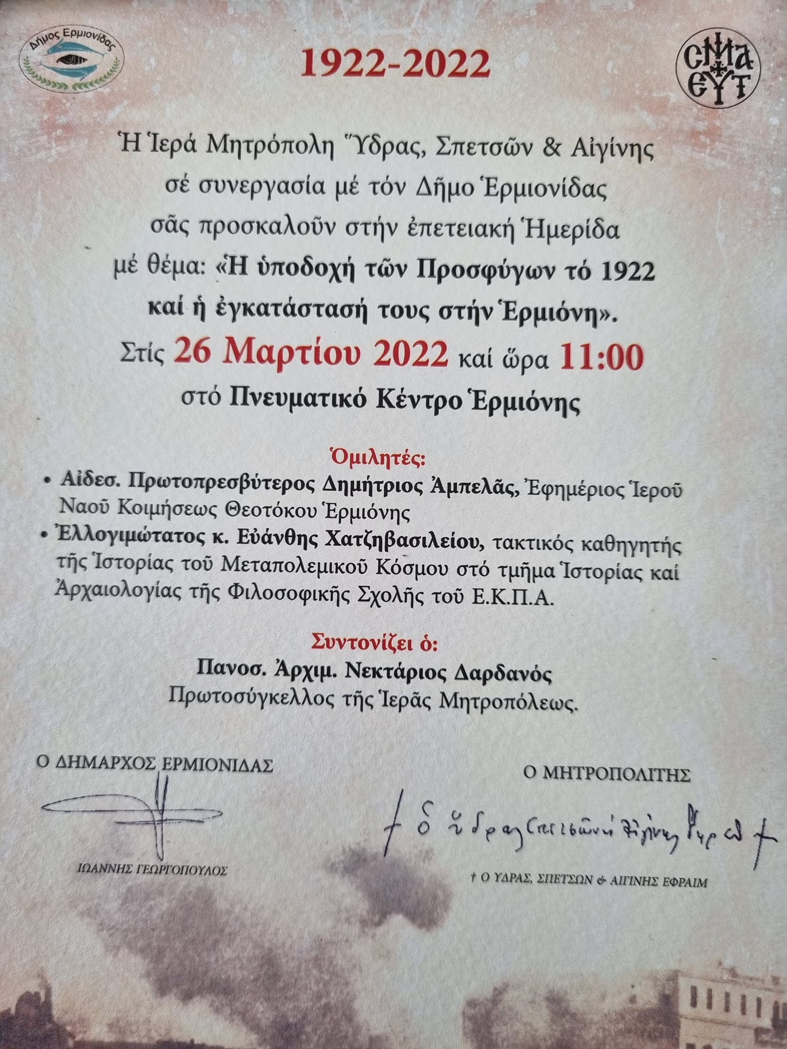 Η Ιερά Μητρόπολη Ύδρας, Σπετσών και Αιγίνης σε συνεργασία με τον Δήμο Ερμιονίδας οργανώνει επετειακή ημερίδα για τα 100 ΧΡΟΝΙΑ από την Μικρασιατική Καταστροφή, το Σάββατο 26 Μαρτίου 2022 στις 11:00 στο Πνευματικό Κέντρο Ερμιόνης.