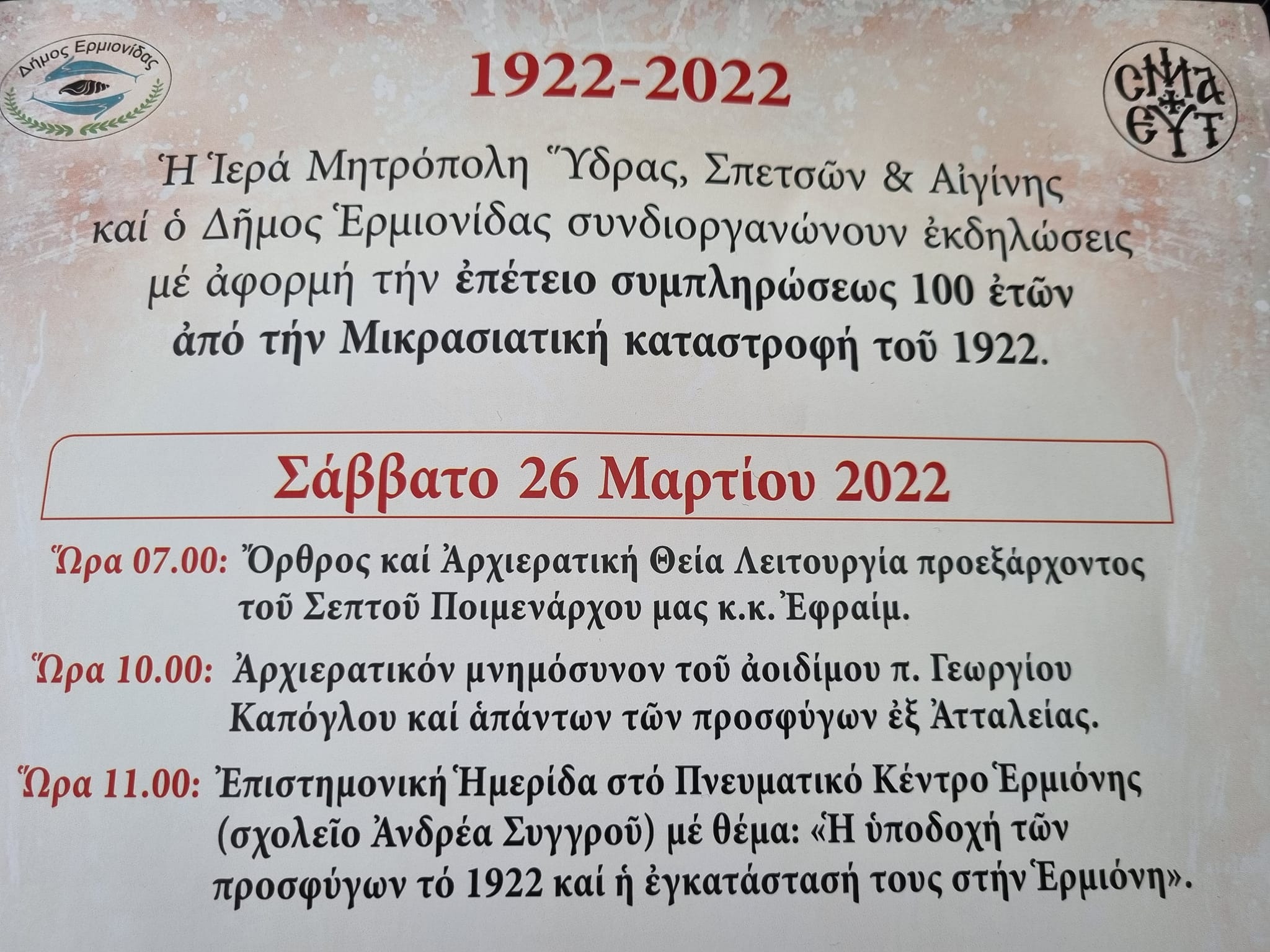 Η Ιερά Μητρόπολη Ύδρας, Σπετσών και Αιγίνης και ο Δήμος Ερμιονίδας συνδιοργανώνουν εκδηλώσεις με αφορμή την επέτειο συμπληρώσεως 100 ετών από την Μικρασιατική καταστροφή του 1922.