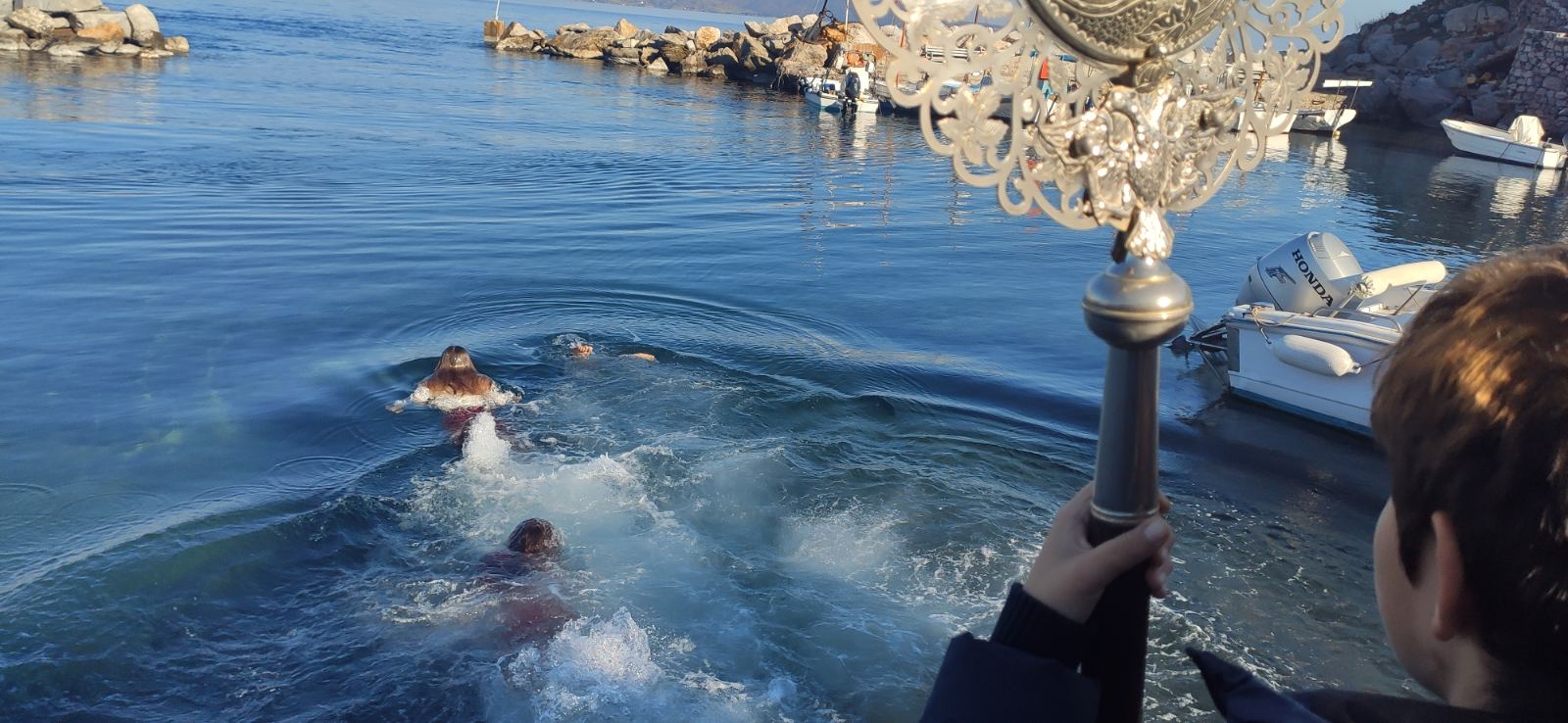 Πλήθος κόσμου παραβρέθηκε για να παρακολουθήσει την κατάδυση του τιμίου σταυρού από τον εφημέριο της ενορίας, π. Ευάγγελο Γκιάκο.