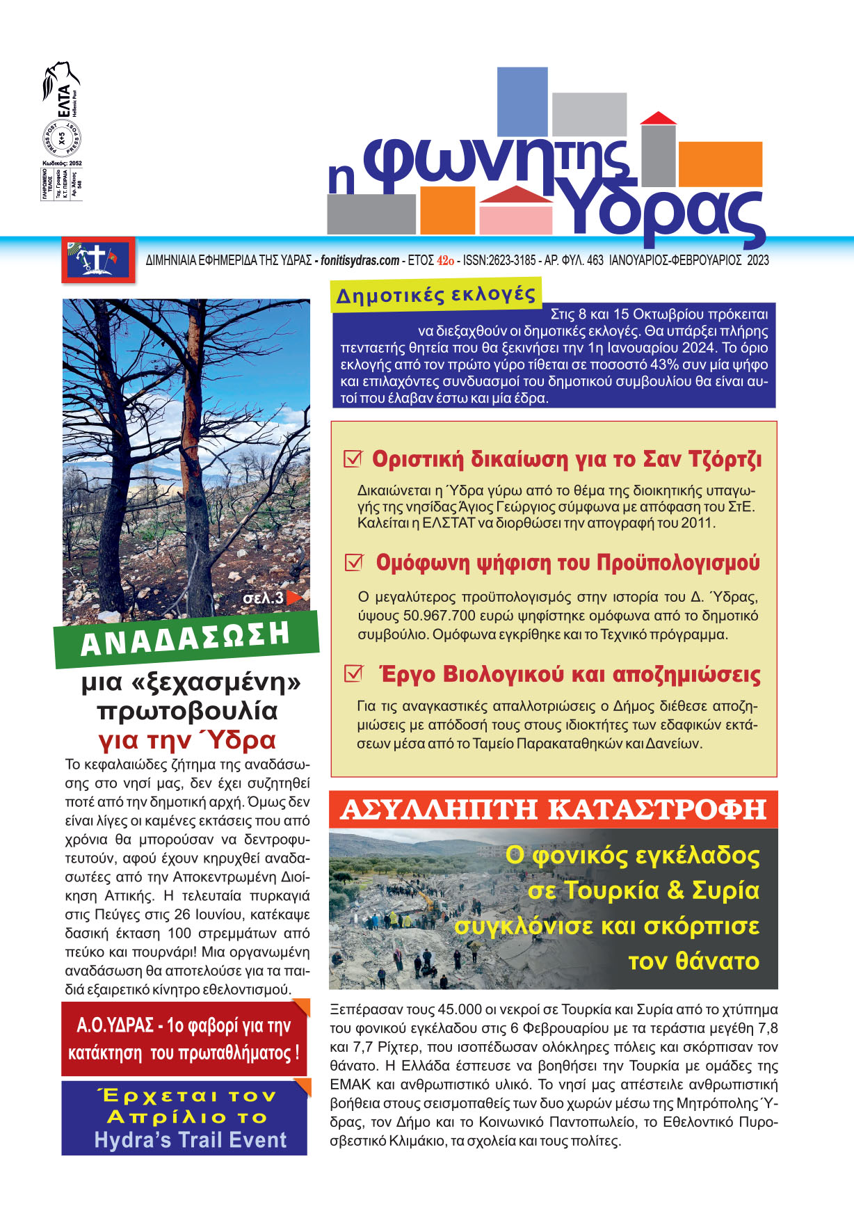 Κυκλοφόρησε το τεύχος (Αρ. Φύλ. 463) Ιανουαρίου – Φεβρουαρίου 2023, της "Φωνής της Ύδρας" με όλα τα νέα του νησιού για το δίμηνο που πέρασε και ό,τι συμβαίνει με καίρια άρθρα και επισημάνσεις.