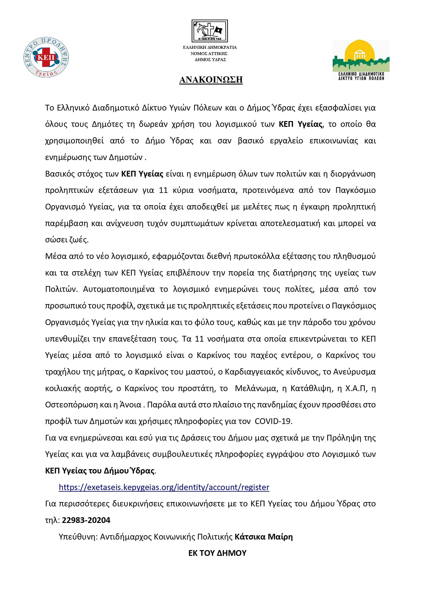 Για το ΚΕΠ Υγείας ο Δήμαρχος Ύδρας Γιώργος Κουκουδάκης ανέφερε: "Με σειρά ουσιαστικών ποιοτικών δράσεων και πρωτοβουλιών ο Δήμος μας φροντίζει για την Υγεία των Κατοίκων της Ύδρας μας! Το ΚΕΠ Υγείας που πριν λίγο καιρό άρχισε να λειτουργεί και στο Νησί μας δίνει έμφαση στην πρόληψη. Συγχαρητήρια στην Αντιδημαρχο Κοινωνικής Πολιτικής για το συντονισμό της όλης δράσης. Στο επίκεντρο της πολιτικής μας βρίσκεται πάντα ο πολίτης!"