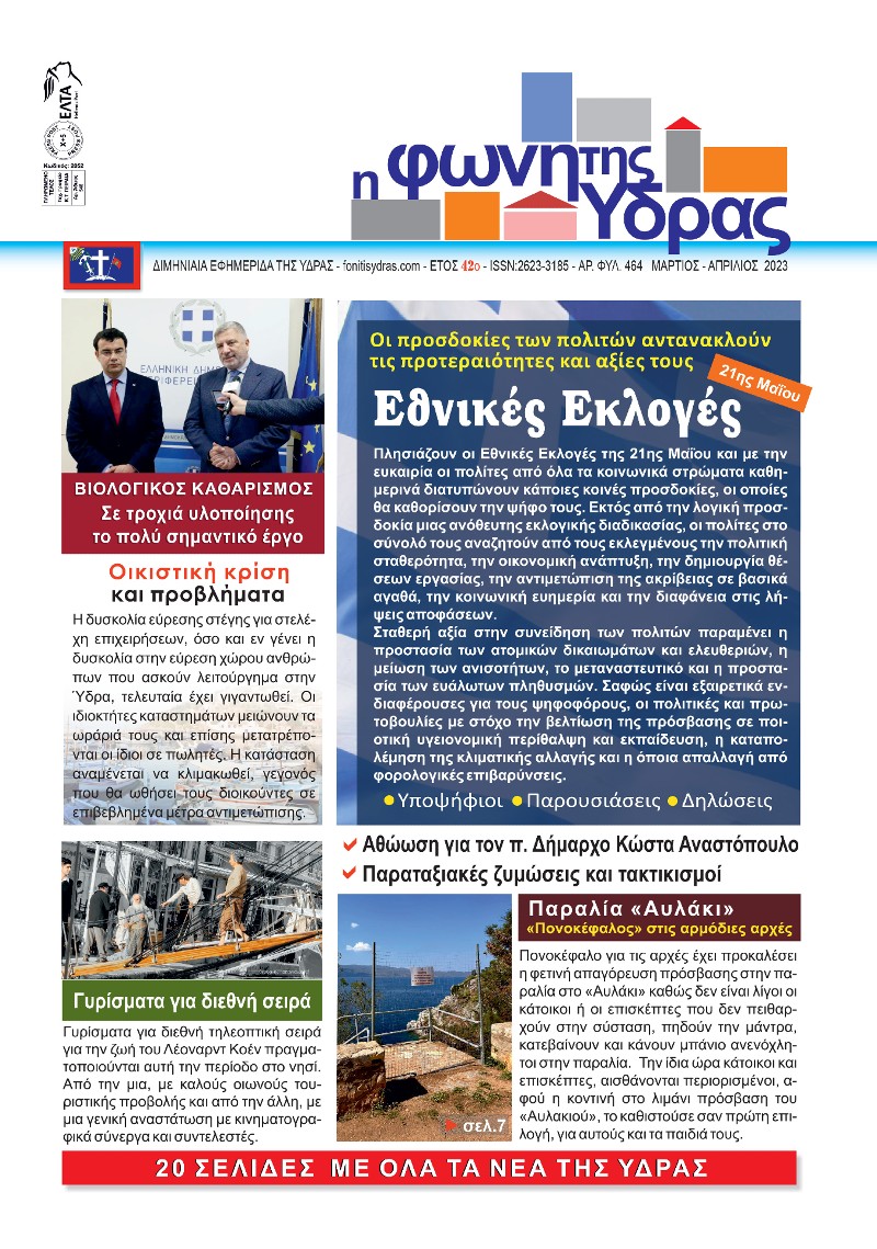 Κυκλοφόρησε το τεύχος (Αρ. Φύλ. 464) Μαρτίου – Απριλίου 2023, της "Φωνής της Ύδρας" με 20 σελίδες με όλα τα νέα του νησιού για το δίμηνο που πέρασε και ό,τι συμβαίνει γενικότερα, με καίρια άρθρα και επισημάνσεις.