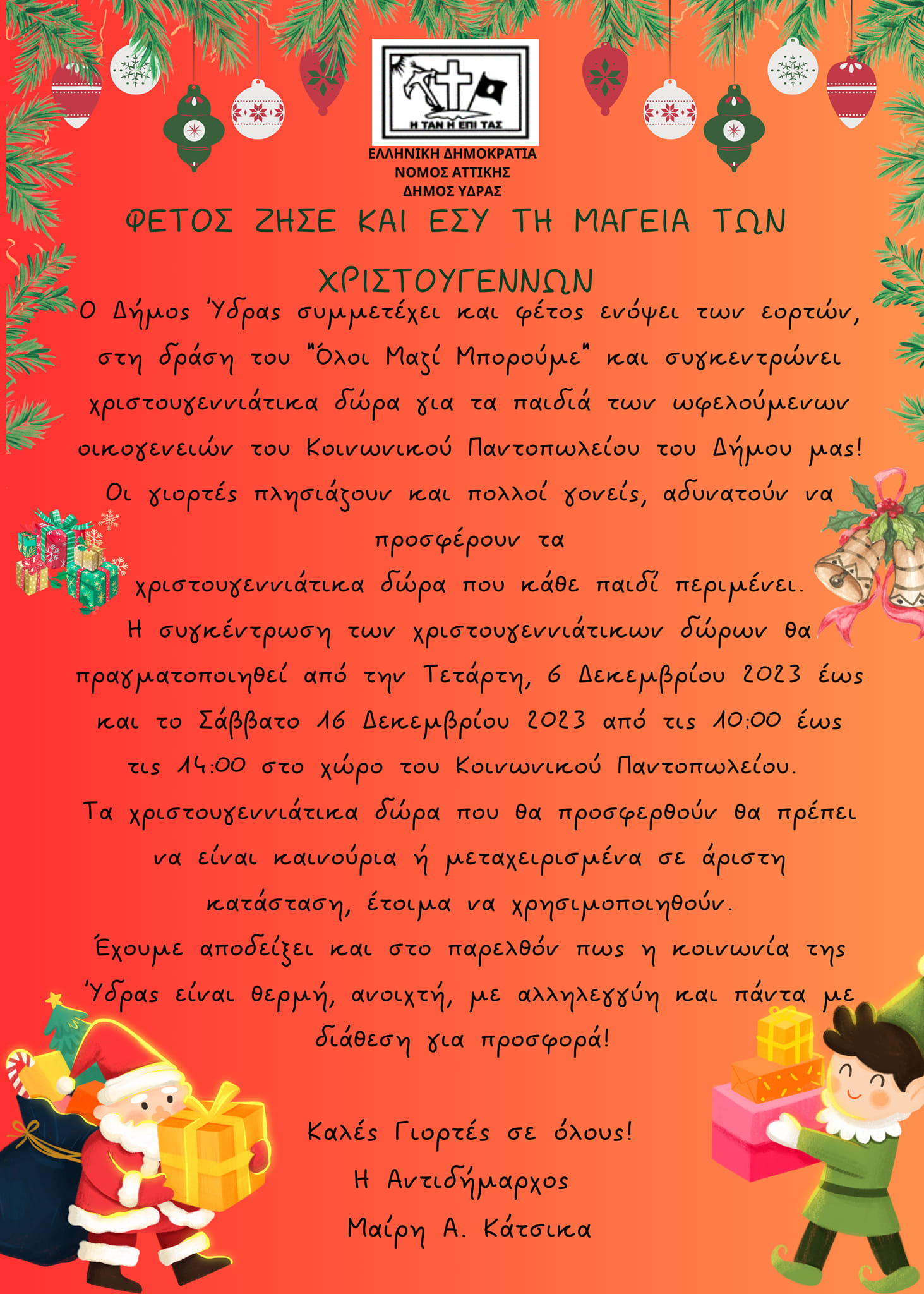 Ο Δήμος Ύδρας σε συνεργασία και φέτος με το «Όλοι Μαζί Μπορούμε» συγκεντρώνει χριστουγεννιάτικα δώρα για τα παιδιά των ωφελούμενων οικογενειών του Κοινωνικού Παντοπωλείου.