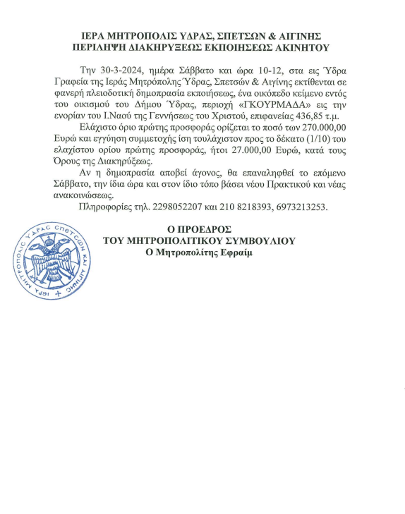 Δημοπρασία Ι. Μητρόπολης Ύδρας, Σπετσών και Αιγίνης για την εκποίηση ενός οικοπέδου εντός οικισμού στην περιοχή "Γκουρμάδα".