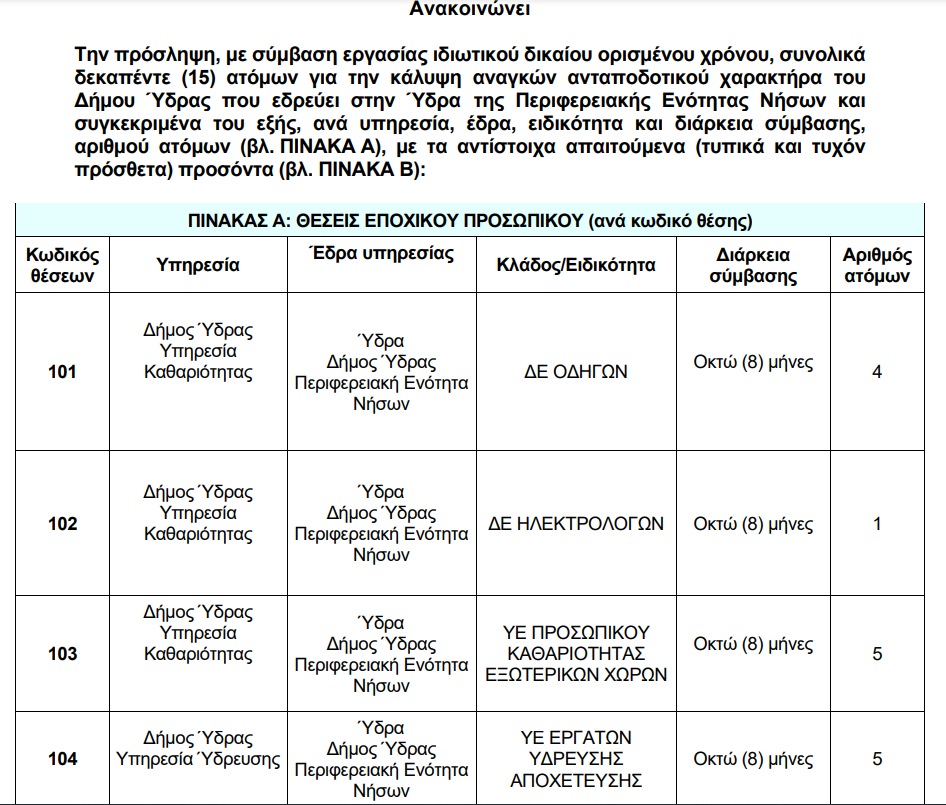 Την πρόσληψη προσωπικού με σύναψη ΣΥΜΒΑΣΗΣ ΕΡΓΑΣΙΑΣ ΟΡΙΣΜΕΝΟΥ ΧΡΟΝΟΥ ανακοίνωσε ο Δήμος Ύδρας συνολικά δεκαπέντε (15) ατόμων για την κάλυψη αναγκών ανταποδοτικού χαρακτήρα για την Υπηρεσία Καθαριότητας ΔΕ ΟΔΗΓΩΝ Οκτώ (8) μήνες 4 άτομα, ΔΕ ΗΛΕΚΤΡΟΛΟΓΩΝ Οκτώ (8) μήνες, 1 άτομο, YE καθαριότητας ΕΞΩΤΕΡΙΚΩΝ ΧΩΡΩΝ, Οκτώ (8) μήνες, 5 άτομα, Υπηρεσία Ύδρευσης ΥΕ ΕΡΓΑΤΩΝ ΥΔΡΕΥΣΗΣ ΑΠΟΧΕΤΕΥΣΗΣ Οκτώ (8) μήνες, 5 άτομα.