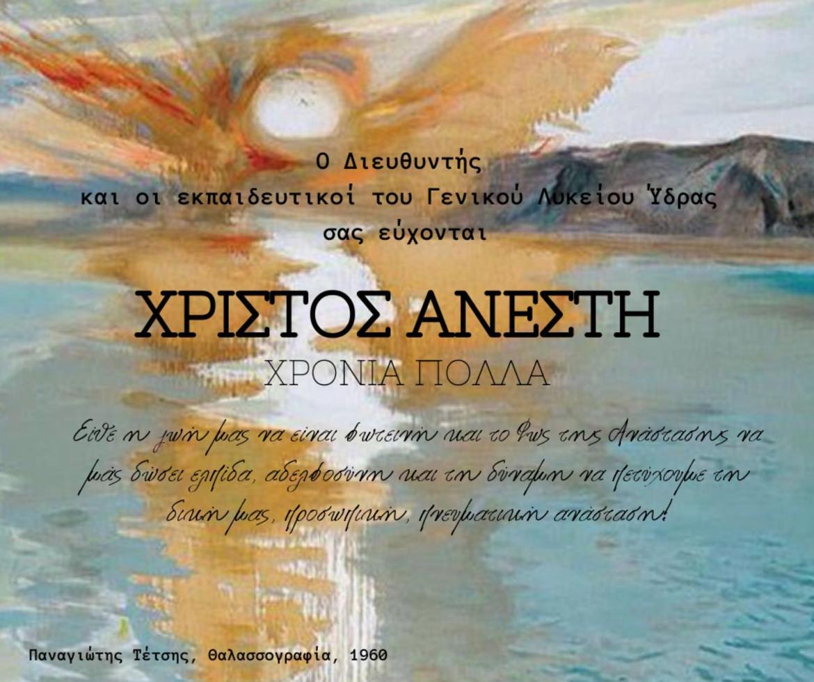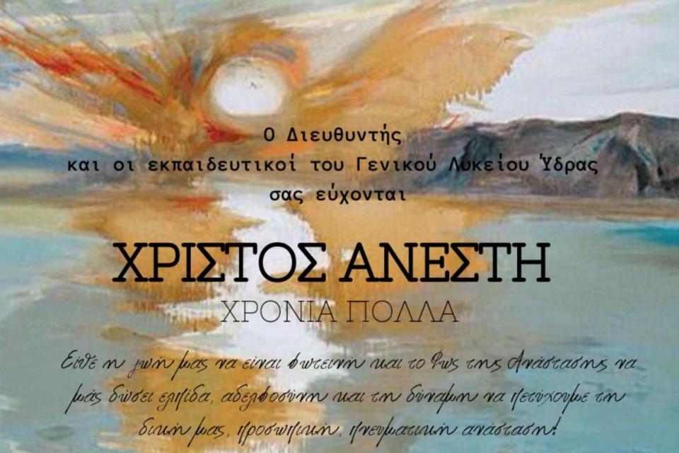 O Διευθυντής Δημήτρης Σαράντης και οι εκπαιδευτικοί του Γενικού Λυκείου Ύδρας εύχονται Χριστός Ανέστη, Χρόνια πολλά!