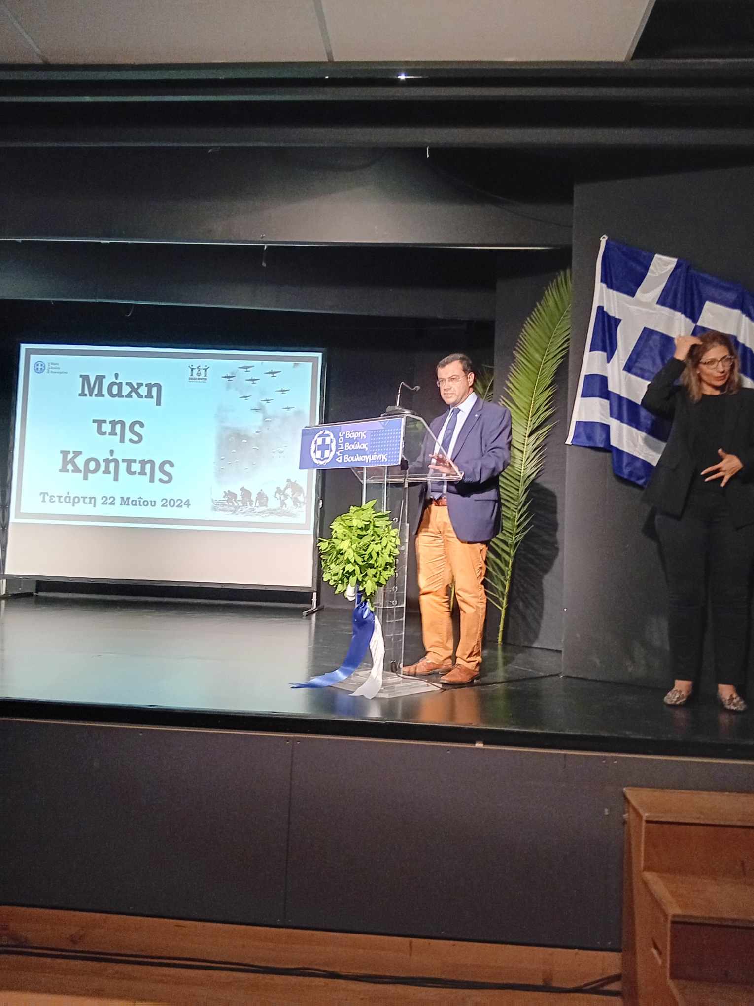 Την Τετάρτη, 22 Μαΐου 2024, ο Δήμαρχος Ύδρας, κ. Γεώργιος Κουκουδάκης, παραβρέθηκε και απηύθυνε χαιρετισμό στην εκδήλωση που διοργάνωσε ο Δήμος Βάρης-Βούλας-Βουλιαγμένης και η Ένωση Κρητών Βάρης-Βούλας-Βουλιαγμένης-Βάρκιζας, αφιερωμένη στη “Μάχη της Κρήτης”, με κεντρικό ομιλητή της εκδήλωσης τον Επίτιμο Αρχηγό του Γενικού Επιτελείου Στρατού, κ. Χαράλαμπο Λαλούση. Κλείνοντας τον χαιρετισμό του, ο Δήμαρχος Ύδρας δεν παρέλειψε να ευχαριστήσει τον Δήμαρχο Βάρης-Βούλας-Βουλιαγμένης, κ. Γρηγόριο Κωνσταντέλλο, για την τιμητική πρόσκληση και φιλοξενία.