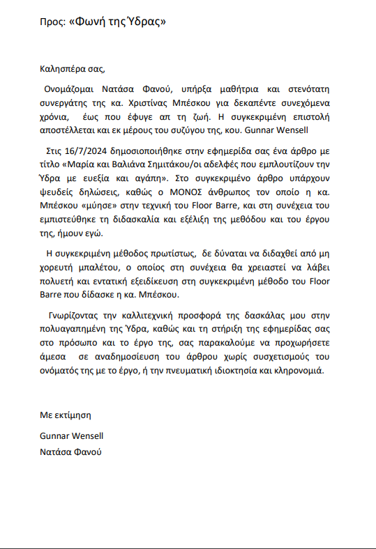 Λάβαμε και δημοσιεύουμε μία επιστολή που αφορά σε απάντηση σε δηλώσεις στο δημοσίευμα της ΦτΥ, "Μαρία και Βαλιάνα Σιμητάκου | Οι αδελφές που εμπλουτίζουν την Ύδρα με Ευεξία και Αγάπη."