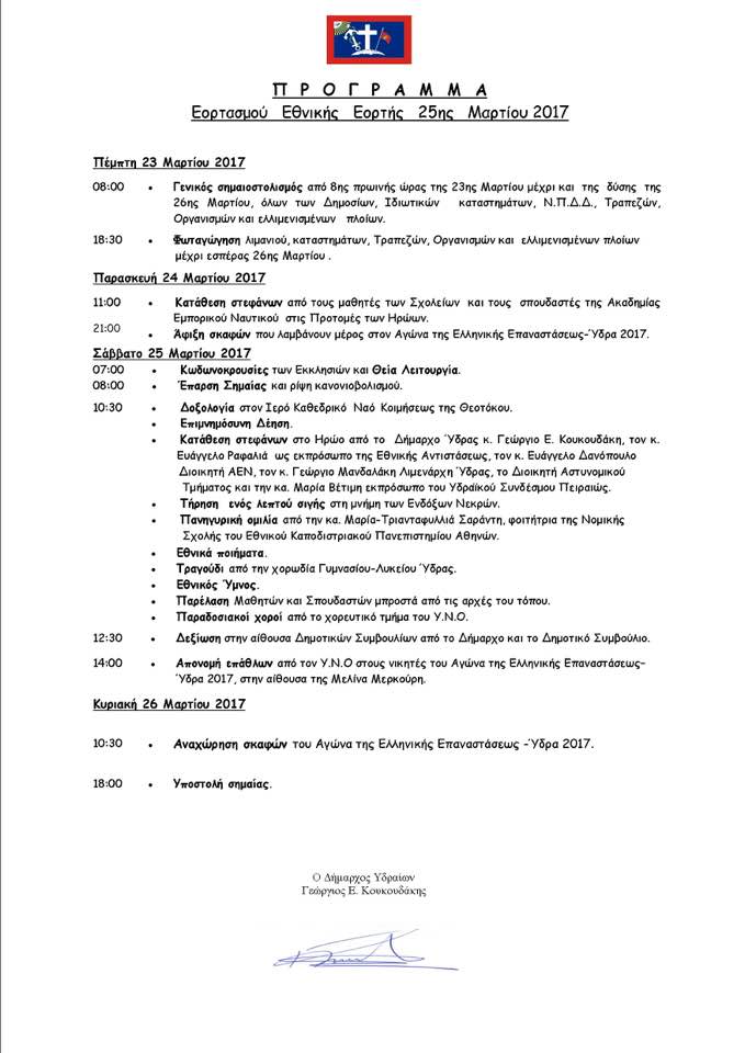 Ακολουθεί το Πρόγραμμα Εορτασμού της εθνικής εορτής της 25ης Μαρτίου από την ΚΕΔΥ του Δήμου Ύδρας.