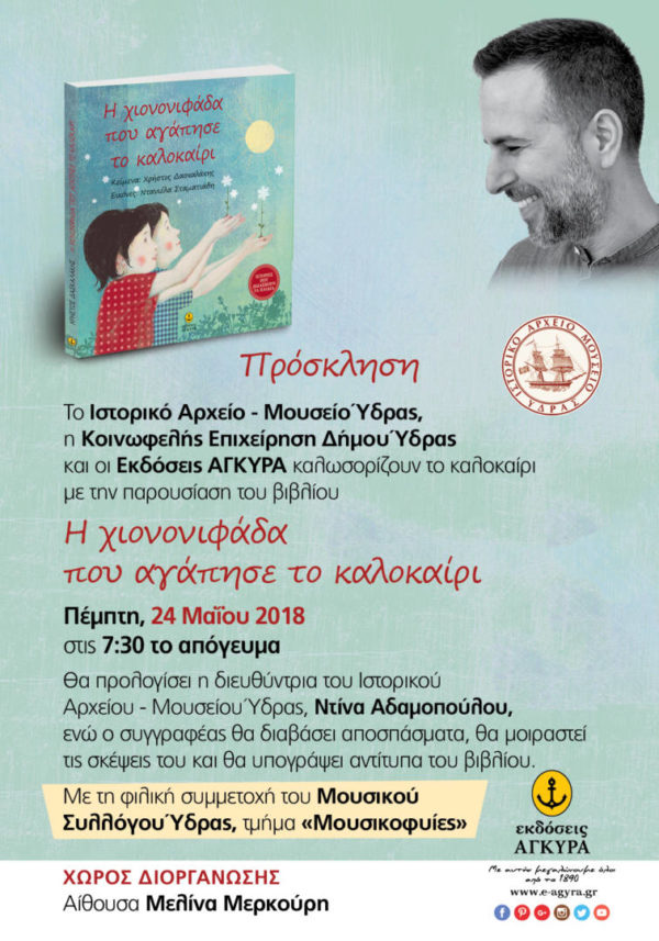 Στην παρουσίαση του βιβλίου του Χρήστου Δασκαλάκη "Η χιονονιφάδα που αγάπησε το καλοκαίρι" προσκαλούν, καλωσορίζοντας το καλοκαίρι, το Ιστορικό Αρχείο-Μουσείο Ύδρας, η Κοινωφελής Επιχείρηση Δήμου Ύδρας και οι εκδόσεις ΑΓΚΥΡΑ.
