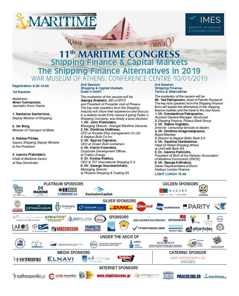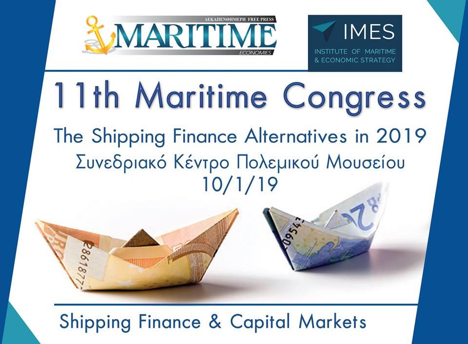 To 11o MARITIME CONGRESS με θέμα: “The Shipping Finance Alternatives in 2019” θα πραγματοποιηθεί στο Συνεδριακό κέντρο του πολεμικού μουσείου στις 10 / 01 / 2019.