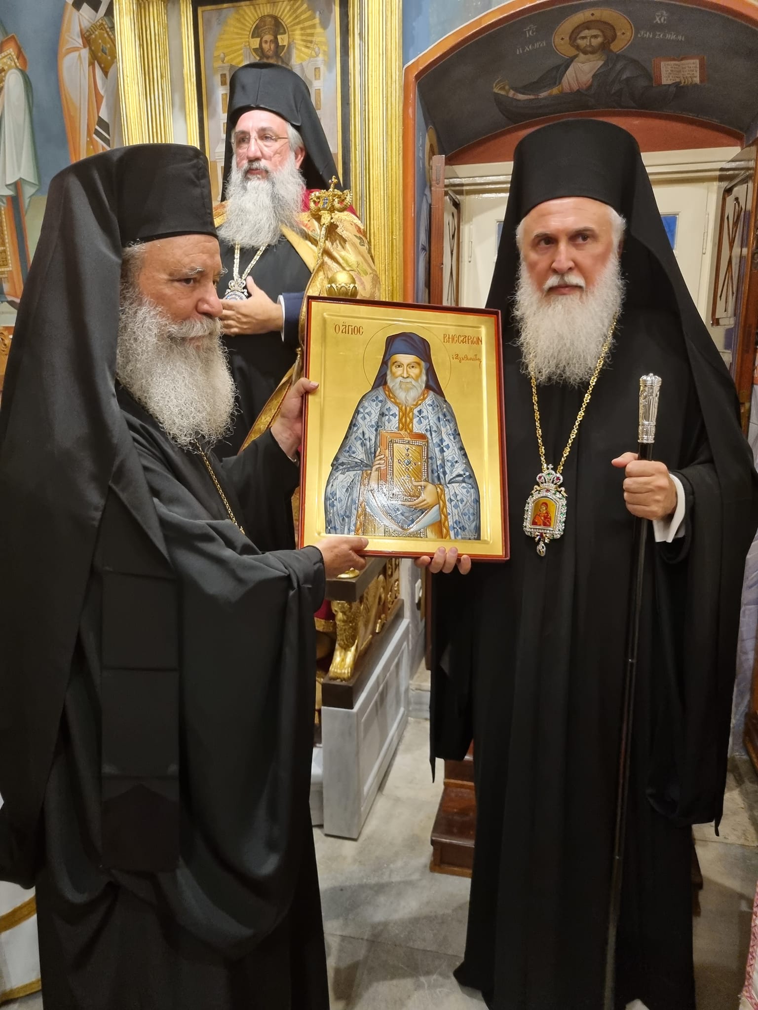 Ο Σεβασμιώτατος Ποιμενάρχης μας προσέφερε στον Αρχιεπίσκοπο την εικόνα του Οσίου Ευμενίου του Σαριδάκη που φιλοτέχνησε η Ι.Μ.Αγίων Πάντων. Ομοίως εις τον Σεβασμιώτατο άγιο Λήμνου την εικόνα του Οσίου Βησσαρίωνος του Αγαθωνίτου.