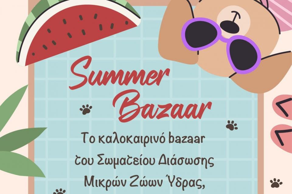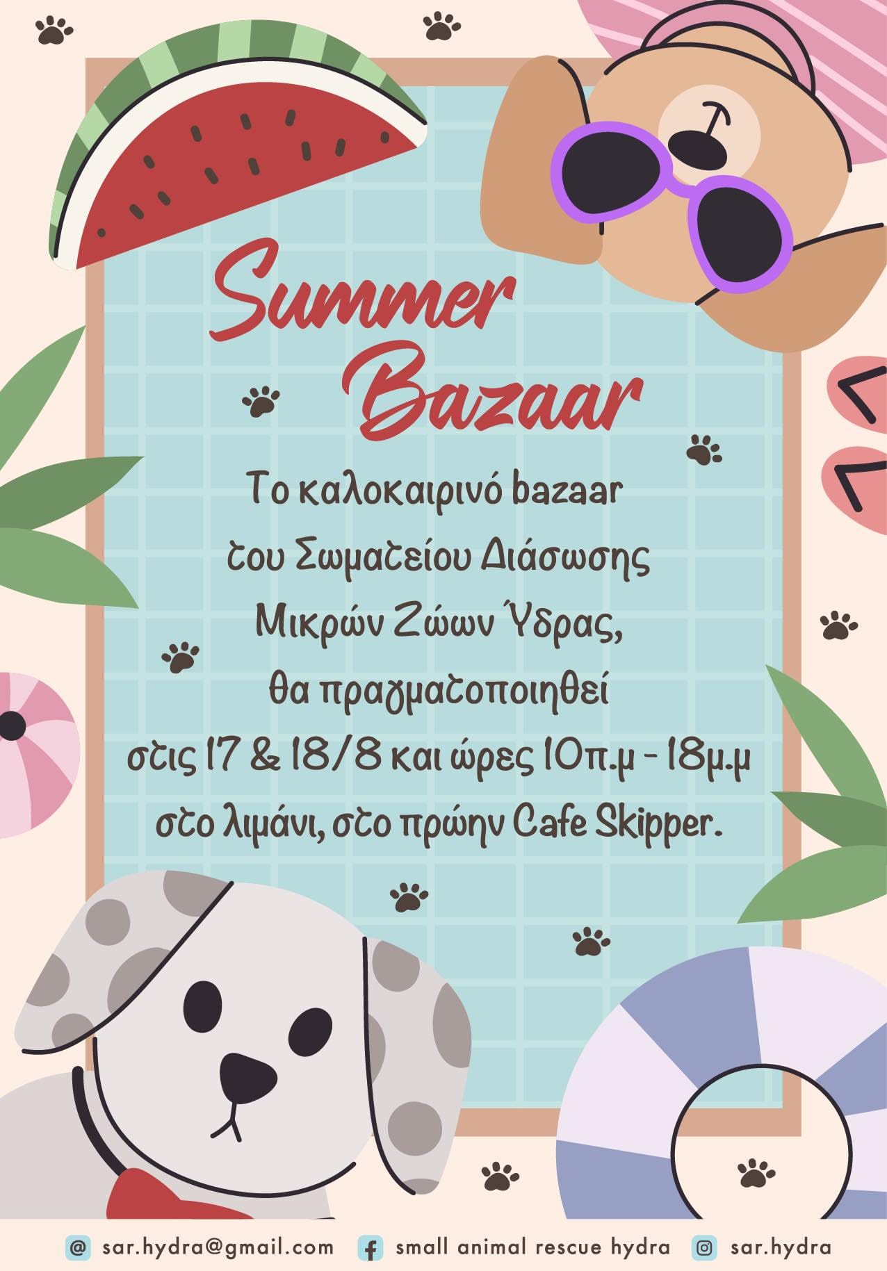 Το καλοκαιρινό του Bazaar θα πραγματοποιήσει το Φιλοζωικό Σωματείο Διάσωση Μικρών Ζώων Ύδρας, στις 17 & 18 Αυγούστου και ώρες 10 π.μ. έως 18:00 μ.μ.στο λιμάνι στο πρώην καφέ Skipper.