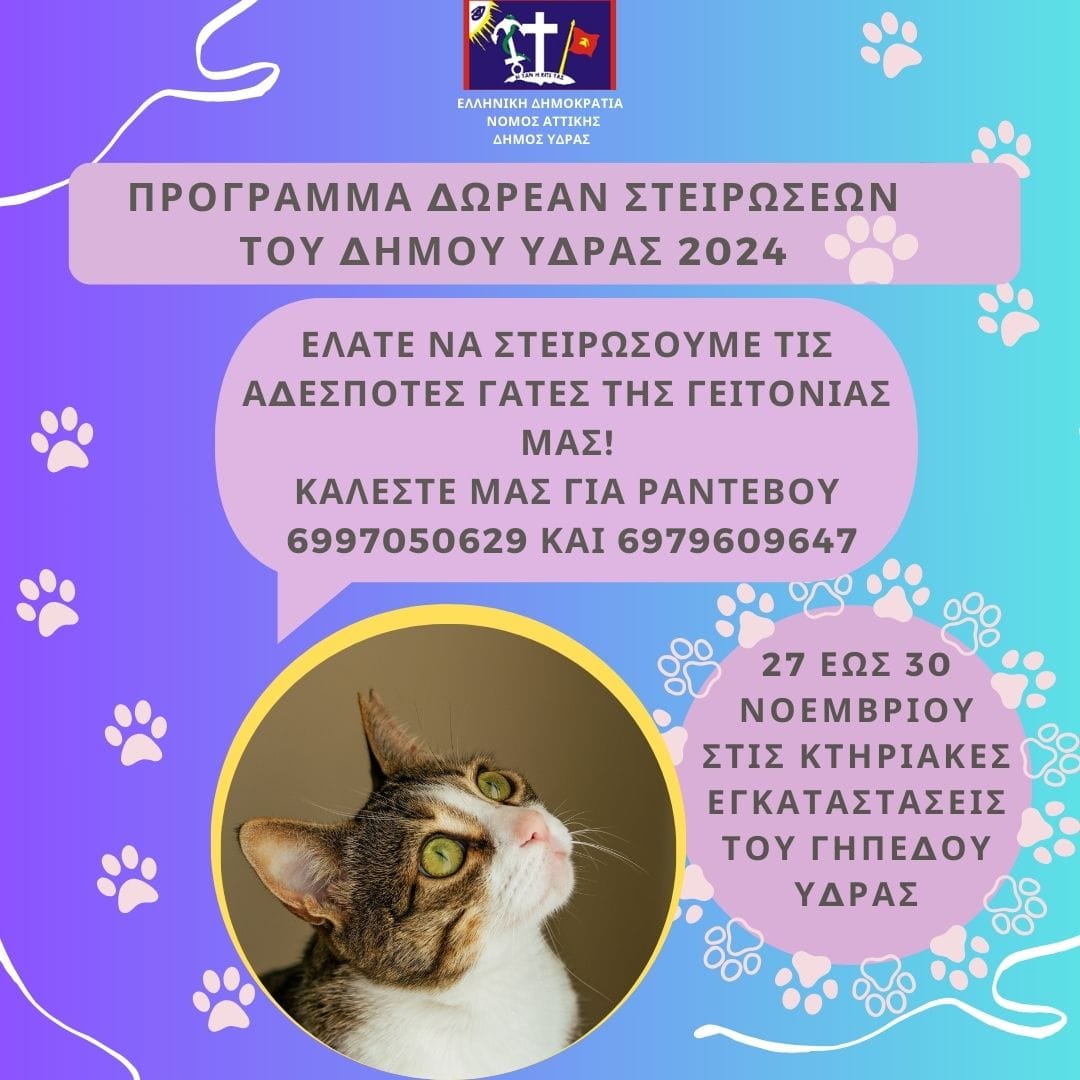 Ο Δήμος Ύδρας συνεχίζει για το 2024 το πρόγραμμα στειρώσεων, εμβολιασμού, ηλεκτρονικής σήμανσης και καταγραφής για τα αδέσποτα ζώα συντροφιάς.